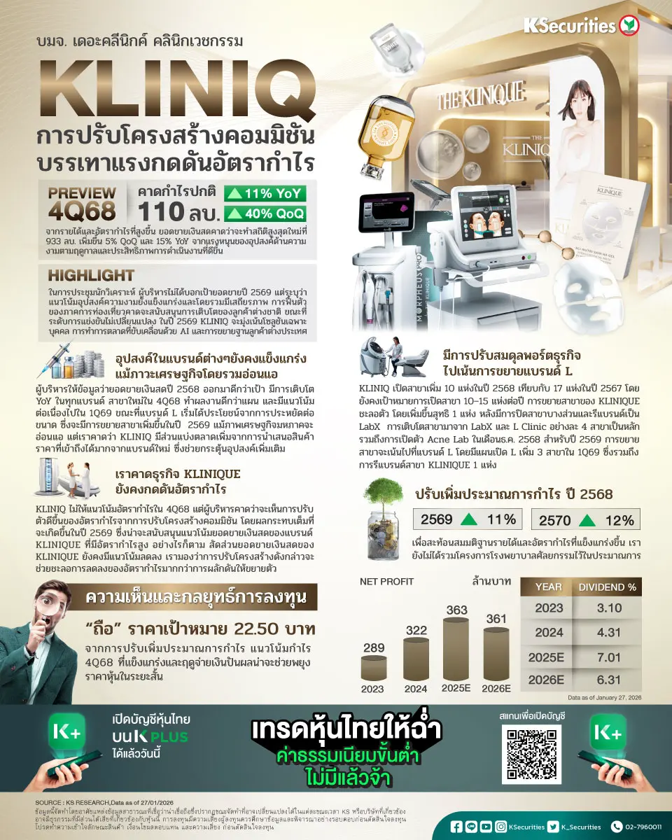 ผู้บริหารให้ข้อมูลว่ายอดขายเงินสดปี 2568 ออกมาดีกว่าเป้า มีการเติบโต YoY ในทุกแบรนด์ สาขาใหม่ในไตรมาส 4/2568 ทำผลงานดีกว่าแผน และมีแนวโน้มต่อเนื่องไปในไตรมาส 1/2569 ขณะที่แบรนด์ L เริ่มได้ประโยชน์จากการประหยัดต่อขนาด ซึ่งจะมีการขยายสาขาเพิ่มขึ้นในปี 2569 แม้ภาพเศรษฐกิจมหภาคจะอ่อนแอ แต่เราคาดว่า KLINIQ มีส่วนแบ่งตลาดเพิ่มจากการนำเสนอสินค้าราคาที่เข้าถึงได้มากจากแบรนด์ใหม่ ซึ่งช่วยกระตุ้นอุปสงค์เพิ่มเติม