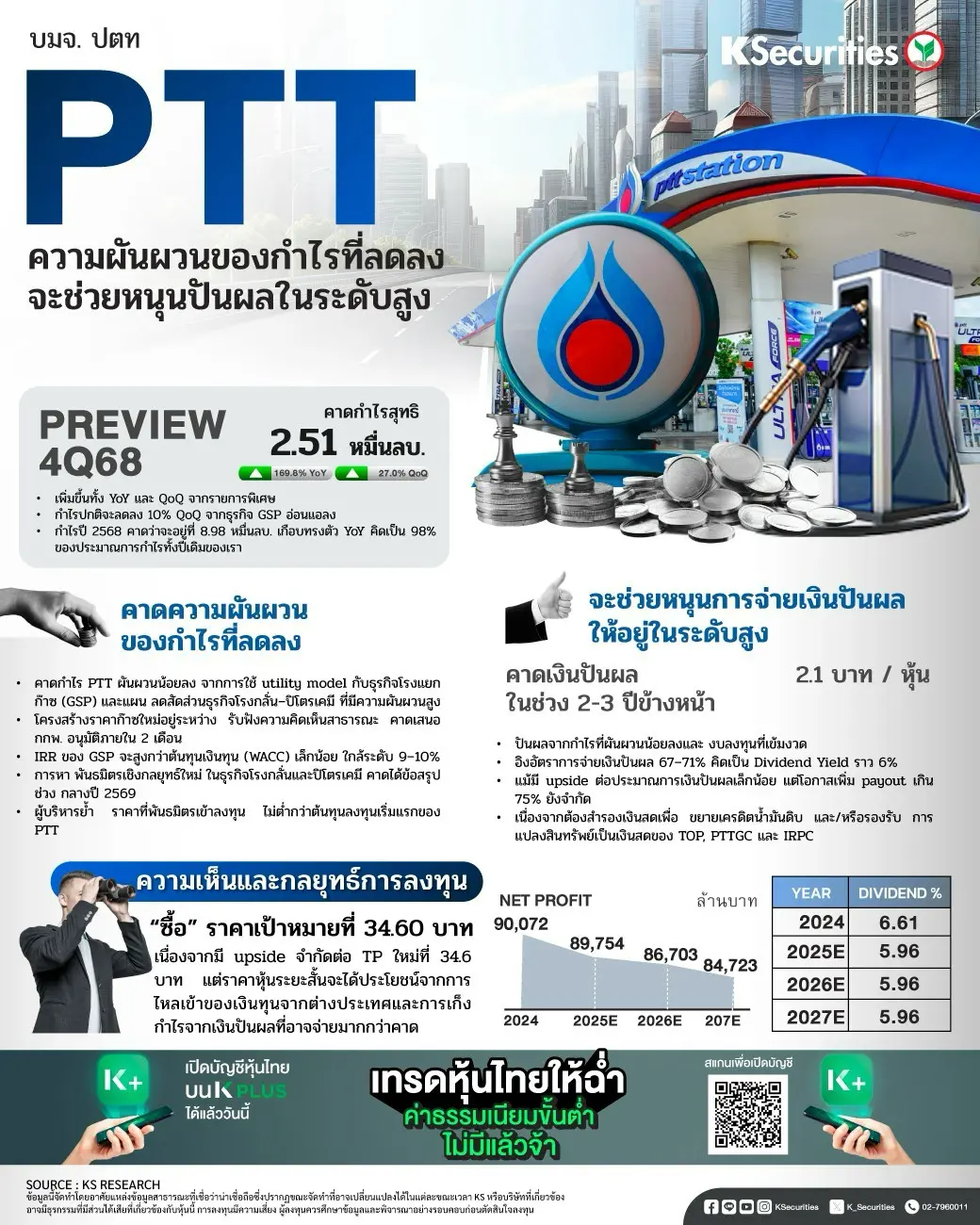 • คาดกำไรสุทธิไตรมาส 4/68 จะอยู่ที่ 2.51 หมื่นลบ. เพิ่มขึ้นทั้ง YoY และ QoQ จากรายการพิเศษ กำไรปกติจะลดลง 10% QoQ จากธุรกิจ GSP อ่อนแอลง
