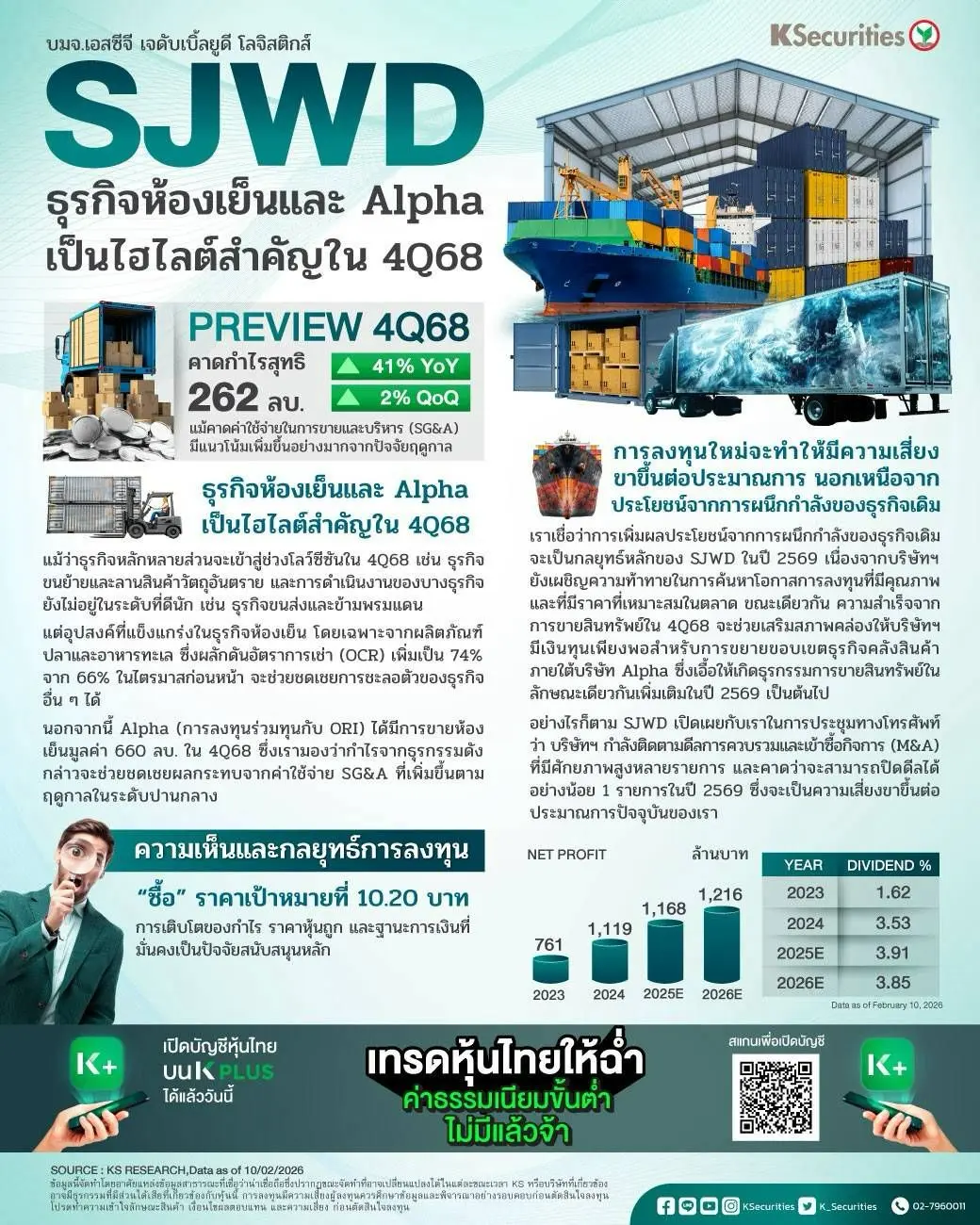 • เราเชื่อว่าการเพิ่มผลประโยชน์จากการผนึกกำลังของธุรกิจเดิมจะเป็นกลยุทธ์หลักของ SJWD ในปี 2569 เนื่องจากบริษัทฯ ยังเผชิญความท้าทายในการค้นหาโอกาสการลงทุนที่มีคุณภาพและที่มีราคาที่เหมาะสมในตลาด ขณะเดียวกัน ความสำเร็จจากการขายสินทรัพย์ในไตรมาส 4/2568 จะช่วยเสริมสภาพคล่องให้บริษัทฯ มีเงินทุนเพียงพอสำหรับการขยายขอบเขตธุรกิจคลังสินค้า ภายใต้บริษัท Alpha ซึ่งเอื้อให้เกิดธุรกรรมการขายสินทรัพย์ในลักษณะเดียวกันเพิ่มเติมในปี 2569 เป็นต้นไป อย่างไรก็ตาม SJWD เปิดเผยกับเราในการประชุมทางโทรศัพท์เมื่อวานนี้ว่า บริษัทฯ กำลังติดตามดีลการควบรวมและเข้าซื้อกิจการ (M&A) ที่มีศักยภาพสูงหลายรายการ และคาดว่าจะสามารถปิดดีลได้อย่างน้อย 1 รายการในปี 2569 ซึ่งจะเป็นความเสี่ยงขาขึ้นต่อประมาณการปัจจุบันของเรา