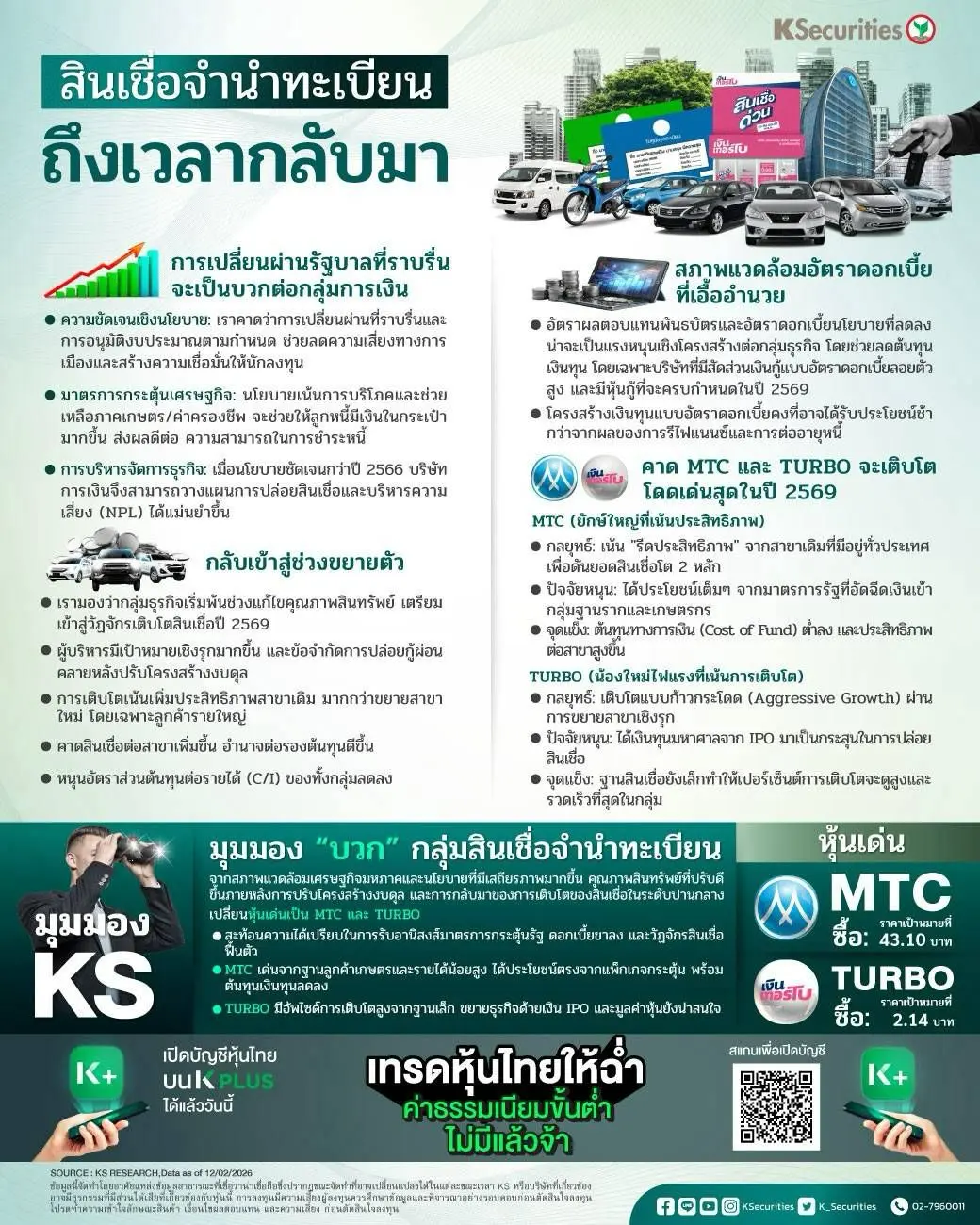 - เราคาดว่ากำไรของ MTC และ TURBO จะเติบโตโดดเด่นกว่าคู่แข่งในปี 2569 จากการผสมผสานระหว่างการเติบโตของสินเชื่อที่แข็งแกร่ง การปรับปรุงประสิทธิภาพด้านต้นทุน และสภาพแวดล้อมต้นทุนเงินทุนที่เอื้ออำนวย โดย MTC อยู่ในตำแหน่งที่ดีในการรักษาการเติบโตของสินเชื่ออัตราตัวเลข 2 หลัก ผ่านการใช้ประโยชน์เครือข่ายสาขาขนาดใหญ่ให้มากขึ้น โดยได้รับอานิสงส์จากมาตรการกระตุ้นเศรษฐกิจของภาครัฐที่มุ่งเป้าไปยังลูกค้าภาคเกษตรและรายได้น้อย ควบคู่กับต้นทุนเงินทุนที่ลดลง ขณะที่ TURBO คาดว่าจะมีการเติบโตเร็วที่สุดในกลุ่ม โดยได้รับแรงหนุนจากฐานสินเชื่อที่ยังมีขนาดเล็ก การขยายสาขาเชิงรุก และการนำเงินที่ได้จากการเสนอขายหุ้น IPO ไปใช้ ซึ่งน่าจะส่งผลให้การเติบโตของสินเชื่อและกำไรสูงกว่าคู่แข่งในกลุ่มธุรกิจเดียวกัน