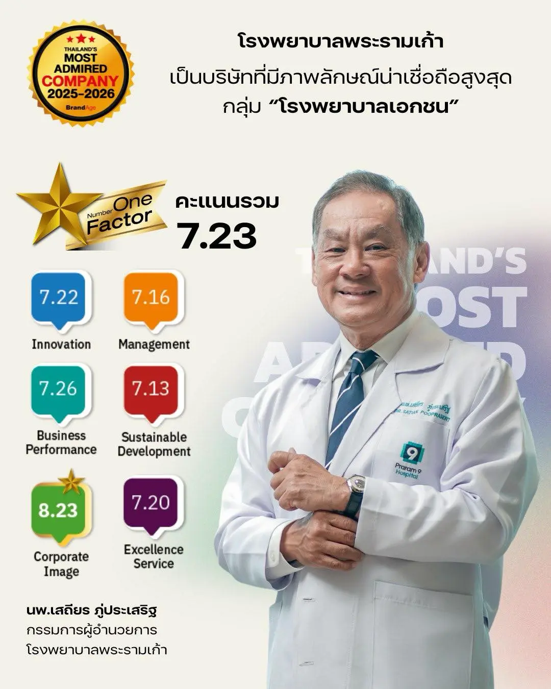 นอกเหนือจากตัวเลขทางการเงิน ปี 2568 ยังเป็นปีที่ PR9 ได้รับรางวัลและการจัดอันดับสำคัญ ซึ่งสะท้อนถึงชื่อเสียง คุณภาพ และภาพลักษณ์ที่แข็งแกร่งได้แก่ รางวัลอันดับ 1 สุดยอดองค์กรแห่งปี ด้านภาพลักษณ์น่าเชื่อถือสูงสุด (Corporate Image Award) จาก BrandAge Magazine และ ติดอันดับ Top 3 กลุ่มโรงพยาบาลเอกชนที่ผู้บริโภคชื่นชมมากที่สุด (Thailand’s Most Admired Company 2025–2026) ถือเป็นคือเครื่องการันตีทั้งด้านมาตรฐานการรักษา การพัฒนาทีมแพทย์และเทคโนโลยี ตลอดจนการใส่ใจประสบการณ์ของผู้ป่วยในทุกขั้นตอน จากเสียงตอบรับที่ดีจากทั้งผู้บริโภคและวงการธุรกิจ