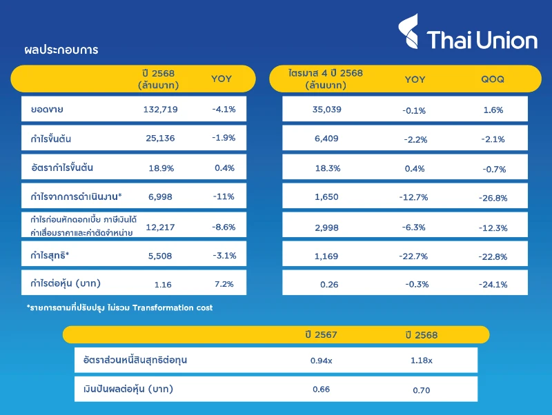 บริษัท ไทยยูเนี่ยน กรุ๊ป จำกัด (มหาชน) หรือ TU รายงานผลประกอบการปี 2568 ด้วยยอดขายรวม 132,719 ล้านบาท และปริมาณการขาย 908,436 แสนตัน เพิ่มขึ้น 2.5% จากปีก่อน เป็นผลจากการเติบโตของกลุ่มผลิตภัณฑ์อาหารทะเลแปรรูป อาหารทะเลแช่แข็ง และอาหารสัตว์เลี้ยง ขณะที่อัตรากำไรขั้นต้นขยายตัวทะลุ 18.9 % สูงสุดเป็นประวัติการณ์ สะท้อนความสามารถในการบริหารจัดการที่มีประสิทธิภาพและการปรับตัวอย่างรวดเร็ว โดยได้รับปัจจัยหนุนจากกลุ่มผลิตภัณฑ์อาหารทะเลแช่แข็งที่ดีขึ้นต่อเนื่อง ส่งผลให้กำไรจากการดำเนินงานตามที่ปรับปรุง โดยไม่รวม transformation cost อยู่ที่ 6,998 ล้านบาท พร้อมตั้งเป้าปี 2569 โต 3-4 % คาด GPM แตะ 19-20 %