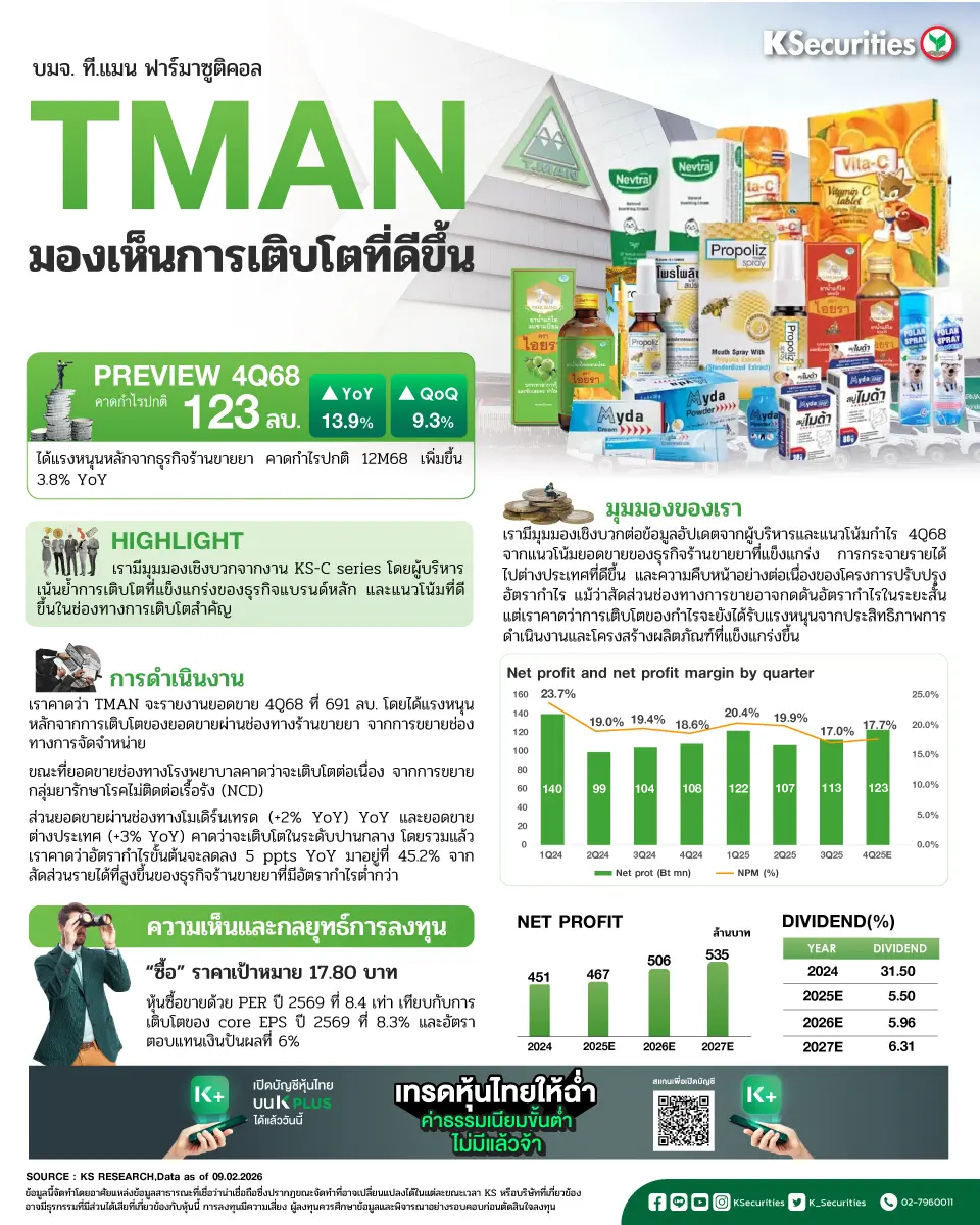 3) การปรับปรุงอัตรากำไรขั้นต้น (GPM) เพิ่มเติมจากการผลิตที่มีประสิทธิภาพและการควบคุมต้นทุน - ในเชิง YTD ราคาหุ้นปรับขึ้น 2.9% เทียบกับ SET ที่เพิ่มขึ้น 6.9% โดย TMAN ซื้อขายด้วย PER ปี 2569 ที่ 8.4 เท่า เทียบกับการเติบโตของกำไรปกติต่อหุ้น (core EPS) ปี 2569 ที่ 8.3% และให้อัตราตอบแทนเงินปันผลปี 2569 ที่ 6%