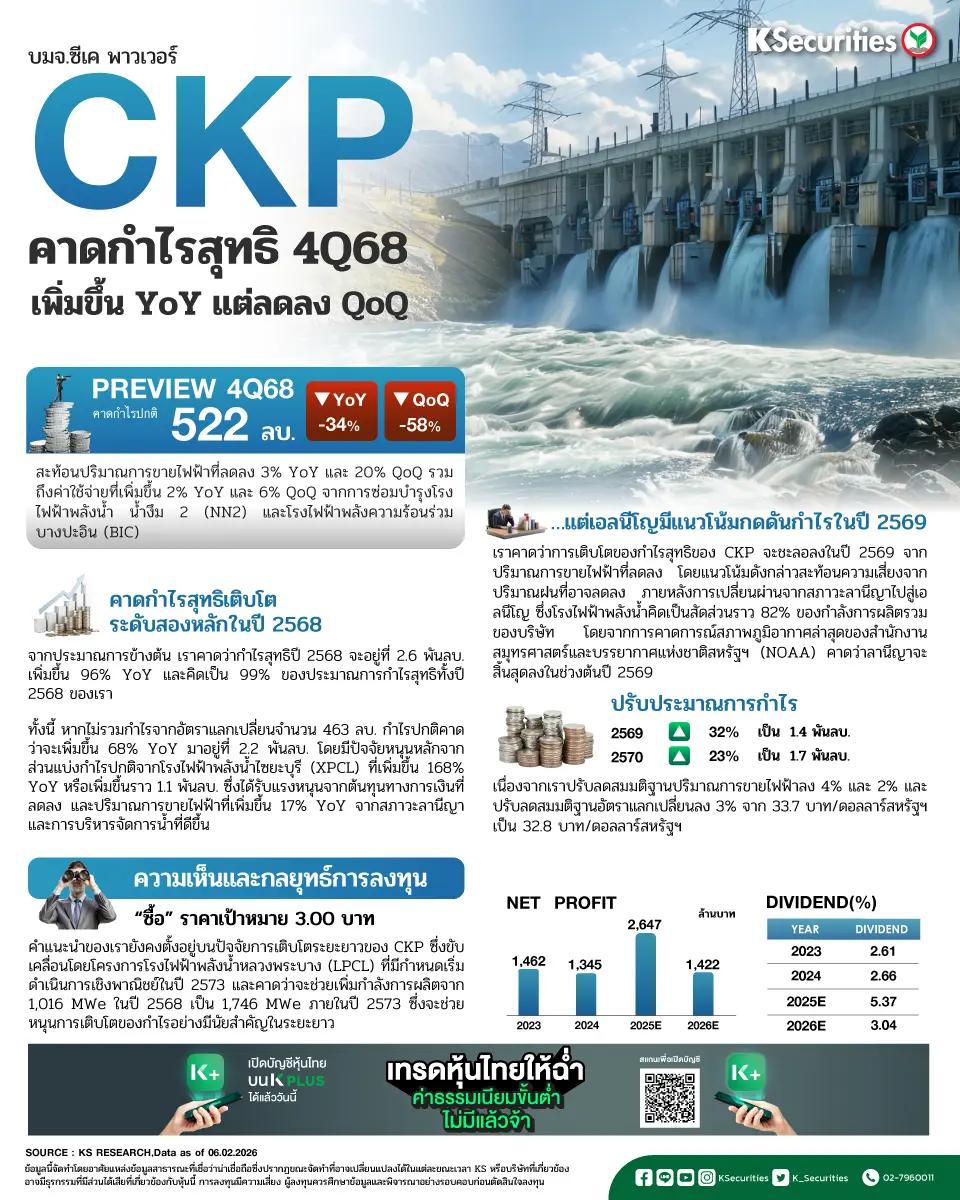 CKP มีกำหนดรายงานงบการเงินไตรมาส 4/2568 ในวันที่ 23 ก.พ. โดยเราคาดว่ากำไรสุทธิไตรมาส 4/2568 จะอยู่ที่ 677 ลบ. เพิ่มขึ้น 25% YoY แต่ลดลง 47% QoQ ทั้งนี้ หากไม่รวมกำไรจากอัตราแลกเปลี่ยนจำนวน 155 ลบ. กำไรปกติคาดว่าจะอยู่ที่ 522 ลบ. ลดลง 34% YoY และ 58% QoQ โดยผลการดำเนินงานที่อ่อนแอลงทั้ง YoY และ QoQ สะท้อนปริมาณการขายไฟฟ้าที่ลดลง 3% YoY และ 20% QoQ รวมถึงค่าใช้จ่ายที่เพิ่มขึ้น 2% YoY และ 6% QoQ จากการซ่อมบำรุงโรงไฟฟ้าพลังน้ำ น้ำงึม 2 (NN2) และโรงไฟฟ้าพลังความร้อนร่วมบางปะอิน (BIC)