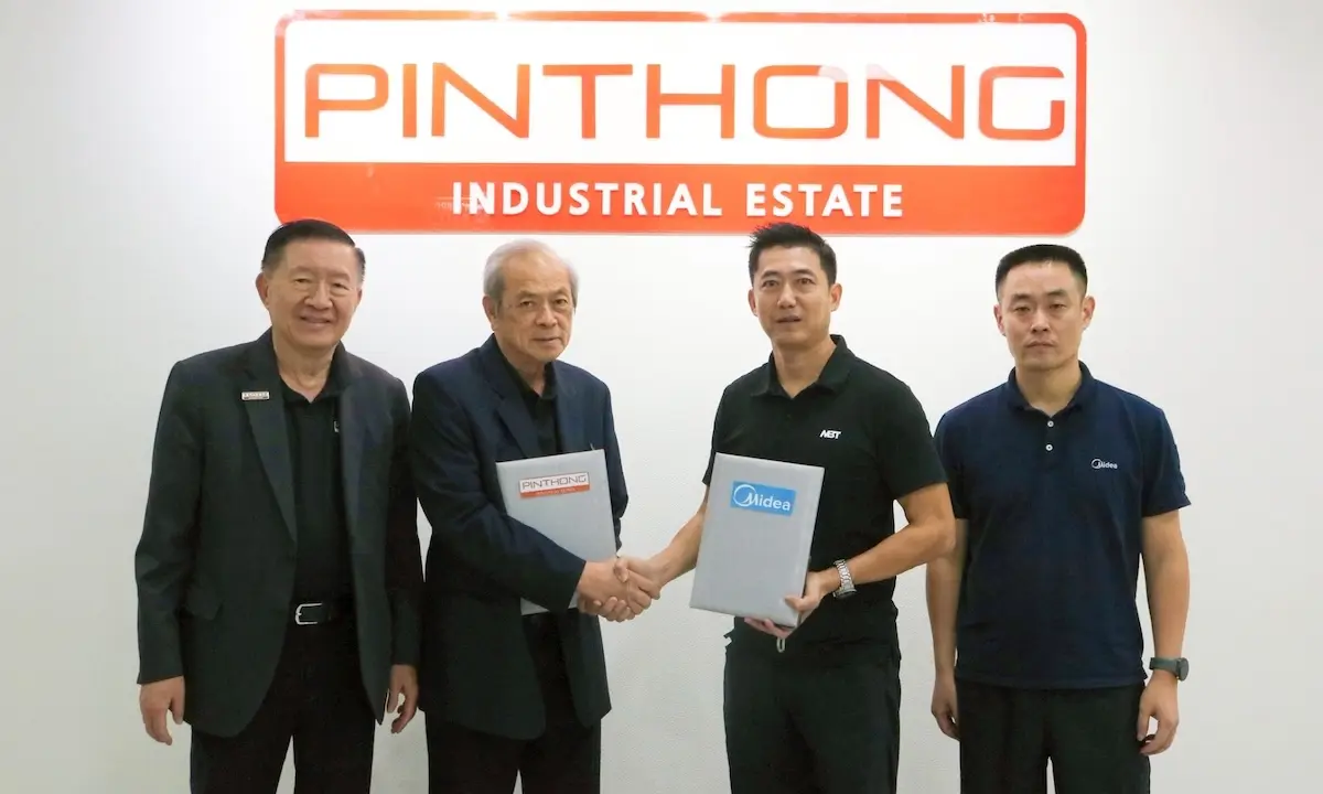เมื่อเร็วๆ นี้ นายสุจินต์ เรียนวิริยะกิจ (ที่ 2 จากซ้าย)  กรรมการบริษัท และ นายสุรัช พัฒนวงศ์ยืนยง  (ที่ 1 จากซ้าย)  กรรมการบริหาร บริษัท ปิ่นทอง อินดัสเตรียล ปาร์ค จำกัด (มหาชน) หรือ PIN ร่วมลงนามในสัญญาซื้อขายที่ดินผืนใหญ่ขนาด 80 ไร่ (128,000 ตารางเมตร) ในนิคมอุตสาหกรรมปิ่นทอง 6 จังหวัดระยอง กับ นายฮ่าน หลิน (ที่ 3 จากซ้าย) ผู้จัดการทั่วไปประจำโรงงานประเทศไทย บริษัท ไมเดีย อินเทลลิเจนท์ แมนูแฟคเจอริ่ง (ประเทศไทย) จำกัด ในเครือ Midea Group ผู้นำเทคโนโลยีเครื่องใช้ไฟฟ้าอัจฉริยะระดับโลกจากจีน โดยการลงนามในครั้งนี้ มีเป้าหมายสำคัญเพื่อให้ไทยเป็นฐานการขยายการผลิตระบบปรับอากาศและระบายอากาศ (HVAC) รวมถึงเครื่องปรับอากาศเชิงพาณิชย์ ภายใต้กลุ่มธุรกิจ Midea Building Solutions ซึ่งครอบคลุมนวัตกรรมการจัดการอาคารครบวงจร  อาทิ ระบบทำความเย็นขนาดใหญ่ (Chiller), โซลูชันอาคารอัจฉริยะ (Smart Building) และเทคโนโลยีประหยัดพลังงาน รองรับโครงการขนาดใหญ่ เช่น ศูนย์การค้า โรงพยาบาล อาคารสำนักงานชั้นนำ และโครงการพัฒนาอสังหาริมทรัพย์ขนาดใหญ่ต่างๆ