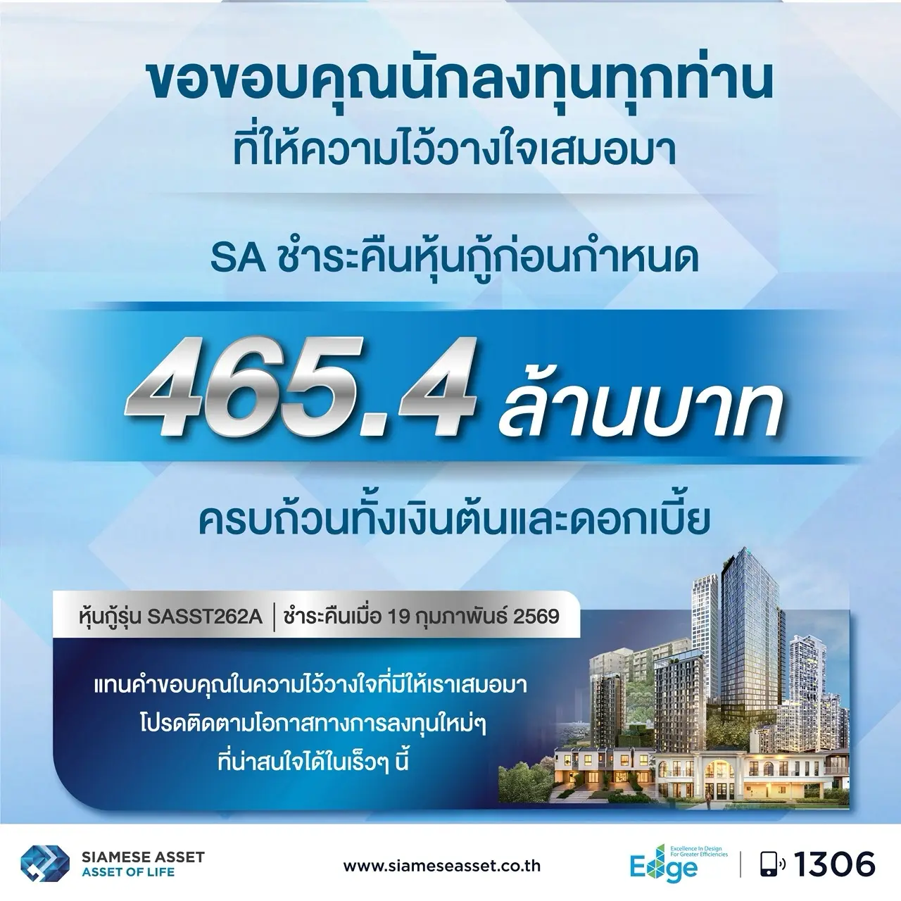 บมจ. ไซมิส แอสเสท (SA) เดินหน้าตามแผนลดหนี้ ชำระคืนหุ้นกู้รุ่น SASST262A ก่อนครบกำหนด ทั้งเงินต้นและดอกเบี้ย รวม 465.4 ล้านบาท โดยกำหนดโอนเงินคืนในวันที่ 19 กุมภาพันธ์นี้ ทั้งนี้ หุ้นกู้รุ่นดังกล่าวมีวันครบกำหนดชำระเดิมในวันที่ 28 กุมภาพันธ์ 2569 การชำระคืนล่วงหน้าครั้งนี้จึงสะท้อนถึงสภาพคล่องที่แข็งแรง และวินัยทางการเงินที่ชัดเจนของบริษัทฯ นักลงทุนหลายรายมองว่า การทยอยคืนหุ้นกู้เช่นนี้ เป็นอีกหนึ่งสัญญาณเชิงบวกต่อเครดิตบริษัทในระยะยาว