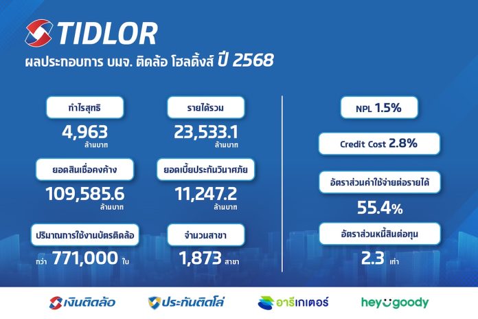 บริษัท ติดล้อ โฮลดิ้งส์ จำกัด (มหาชน) หรือ Tidlor Holdings หรือ กลุ่มบริษัท (TIDLOR) ประกาศความสำเร็จผลการดำเนินงานประจำปี 2568 โดย นางสาวชลธิชา ทองไทย ผู้บริหารระดับสูงฝ่ายบัญชีและการเงิน (CFO) เปิดเผยว่า ภาพรวมผลการดำเนินงานในปีที่ผ่านมา กลุ่มบริษัทสามารถทำกำไรสุทธิสถิติสูงสุดใหม่ที่ 4,963 ล้านบาท เพิ่มขึ้น 17.4% เมื่อเทียบกับปีก่อน (YoY) ซึ่งเป็นผลสำเร็จจากการขับเคลื่อนธุรกิจภายใต้กลยุทธ์การเติบโตอย่างมีคุณภาพทั้งธุรกิจสินเชื่อทะเบียนรถและธุรกิจนายหน้าประกันภัย ควบคู่กับการบริหารคุณภาพสินเชื่อและต้นทุนอย่างรอบคอบ โดยในปี 2568 กลุ่มบริษัทมีรายได้รวม 23,533.1 ล้านบาท เพิ่มขึ้น 6.2% (YoY) โดยมีแรงขับเคลื่อนหลักจากรายได้ดอกเบี้ยรับตามการขยายตัวของพอร์ตสินเชื่อ และรายได้ค่าธรรมเนียมและบริการจากธุรกิจนายหน้าประกันภัย ซึ่งยังคงเป็นหนึ่งในแหล่งรายได้สำคัญ นอกจากนี้ยังสามารถขยายฐานลูกค้าของทั้งสองธุรกิจได้อย่างต่อเนื่องจากช่องทางการจำหน่ายหลากหลาย (Omni-Channel) และในปี 2568 มีสาขารวมทั้งสิ้น 1,873 แห่ง ทั่วประเทศ