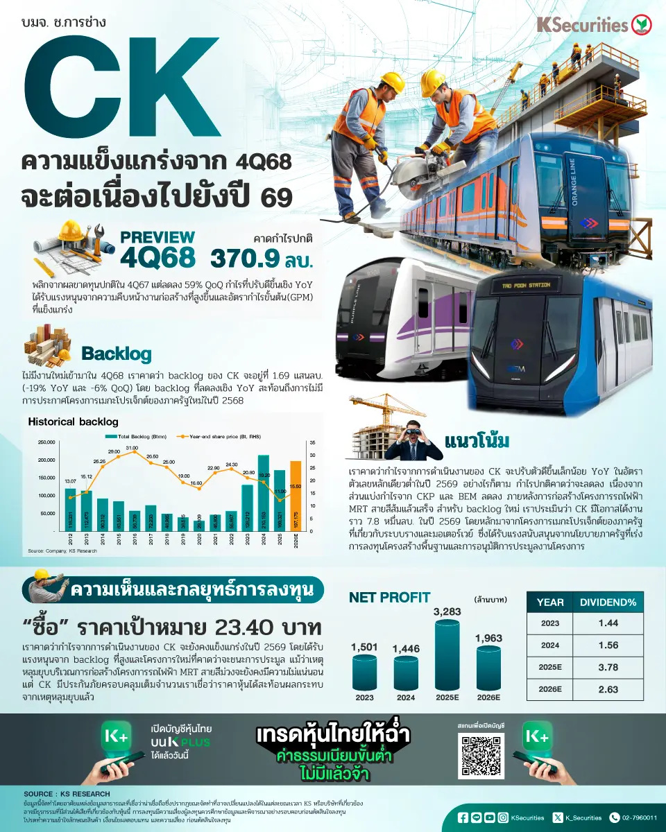 - เราคงคำแนะนำ “ซื้อ” สำหรับ CK และราคาเป้าหมายสิ้นปี 2569 ที่ 23.4 บาท เราคาดว่ากำไรจากการดำเนินงานของ CK จะยังคงแข็งแกร่งในปี 2569 โดยได้รับแรงหนุนจาก backlog ที่สูงและโครงการใหม่ที่คาดว่าจะชนะการประมูล ซึ่งจะช่วยกระตุ้นความเชื่อมั่นต่อไป แม้ว่าเหตุหลุมยุบบริเวณการก่อสร้างโครงการรถไฟฟ้า MRT สายสีม่วงจะยังคงมีความไม่แน่นอน แต่ CK มีประกันภัยครอบคลุมเต็มจำนวนสำหรับโครงการมูลค่า 1.5 หมื่นลบ. และค่าใช้จ่ายในการซ่อมแซมจนถึงปัจจุบันยังคงต่ำกว่า 100 ลบ. เราเชื่อว่าราคาหุ้นได้สะท้อนผลกระทบจากเหตุหลุมยุบแล้ว
