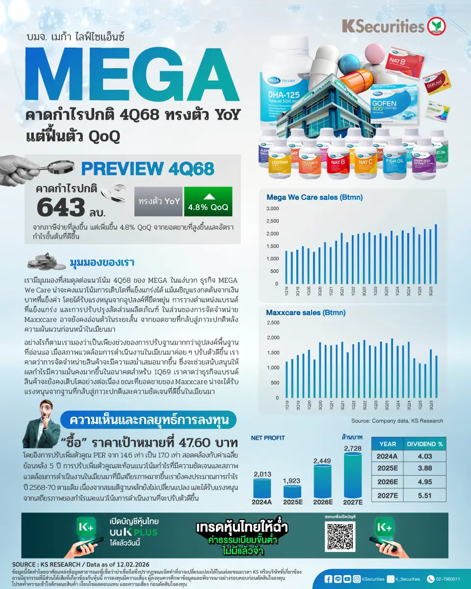 เราคาดว่า MEGA จะประกาศงบการเงินไตรมาส 4/2568 โดยมีกำไรสุทธิ 544 ลบ. หากไม่รวมผลขาดทุนจากอัตราแลกเปลี่ยน 99 ลบ. เราประเมินกำไรปกติที่ 643 ลบ. ทรงตัว YoY จากภาษีจ่ายที่สูงขึ้น แต่เพิ่มขึ้น 4.8% QoQ จากยอดขายที่สูงขึ้นและอัตรากำไรขั้นต้นที่ดีขึ้น เราคาดว่ากำไรปกติในช่วง 12M68 จะลดลง 11% จากปี 2567 นอกจากนี้ เรายังคาดว่า MEGA จะจ่ายเงินปันผลต่อหุ้น (DPS) ที่ 0.74 บาท คิดเป็นอัตราการจ่ายปันผล 62% และอัตราตอบแทนเงินปันผลต่อปี 3.7% MEGA