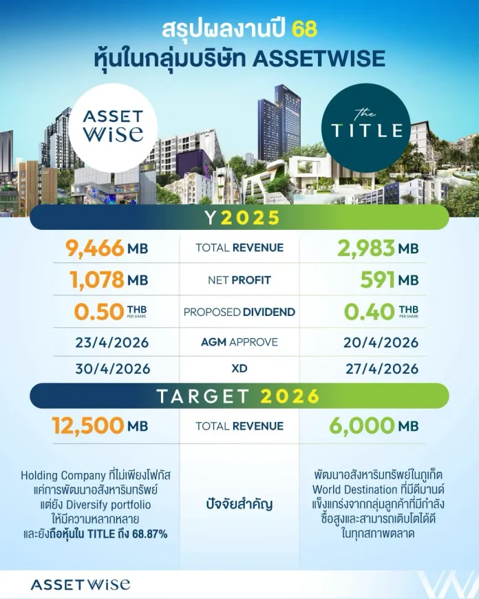 นายกรมเชษฐ์ วิพันธ์พงษ์ ประธานเจ้าหน้าที่บริหาร บริษัท แอสเซทไวส์ จำกัด (มหาชน) หรือ ASW กล่าวว่า ASW สามารถสร้างผลการดำเนินงานปี 2568 ได้อย่างมีประสิทธิภาพ โดยมียอดขายทั้งปี 23,407 ล้านบาท เติบโตจากปีก่อน 21% ขณะที่รายได้รวมอยู่ที่ 9,466 ล้านบาท และมีกำไรสุทธิ 1,078 ล้านบาท โดยเฉพาะไตรมาส 4/68 บริษัททำรายได้และกำไรสุทธิเติบโตขึ้นเมื่อเทียบกับไตรมาสก่อนหน้า (QoQ) และปีก่อนหน้า (YoY) จากการเร่งผลักดันยอดโอนกรรมสิทธิ์โครงการเดอะ ไทเทิล เลเจนดารี บางเทา (THE TITLE Legendary Bang-Tao) รวมถึงโครงการเคฟ วันเดอร์แลนด์ (Kave Wonderland) และโมดิซ อาวองการ์ด (Modiz Avantgarde) ซึ่งสร้างเสร็จเร็วกว่าแผนที่กำหนดไว้ต้นปี 2569 ทำให้ ASW สามารถทยอยรับรู้รายได้ตั้งแต่ปลายปีที่ผ่านมา