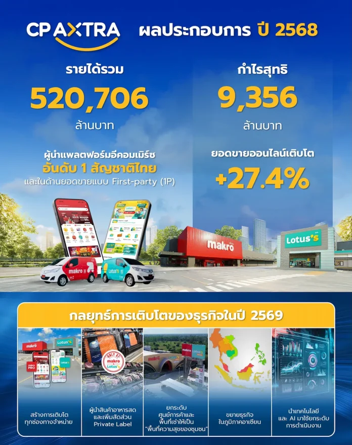 บริษัท ซีพี แอ็กซ์ตร้า จำกัด (มหาชน) หรือ CPAXT ผู้ดำเนินธุรกิจค้าส่งค้าปลีก แม็คโคร-โลตัส เผยผลประกอบการปี 2568 ด้วยรายได้รวม 520,706 ล้านบาท และมีกำไรสุทธิ 9,356 ล้านบาท โดยได้รับแรงหนุนจาก