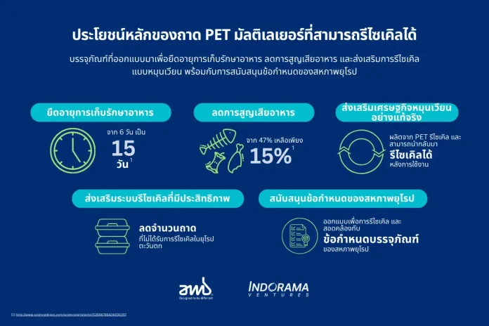 บริษัท อินโดรามา เวนเจอร์ส จำกัด (มหาชน) ผู้ผลิตเคมีภัณฑ์ชั้นนำระดับโลกที่ดำเนินธุรกิจอย่างยั่งยืน และ AMB Spa หนึ่งในผู้ผลิตบรรจุภัณฑ์ชั้นนำของยุโรปได้เปิดตัวถาดพลาสติกรุ่นใหม่แบบมัลติเลเยอร์ที่ออกแบบให้สามารถรีไซเคิลได้ เพื่อสนับสนุน “ระเบียบว่าด้วยบรรจุภัณฑ์และของเสียจากบรรจุภัณฑ์” ของสหภาพยุโรป (Packaging and Packaging Waste Regulation: PPWR) และเร่งการสร้างระบบเศรษฐกิจหมุนเวียนอย่างแท้จริงสำหรับบรรจุภัณฑ์อาหารที่มีความซับซ้อน