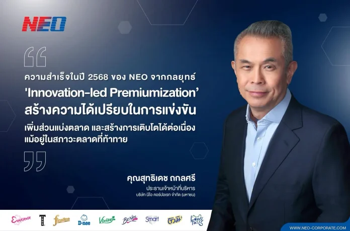นายสุทธิเดช ถกลศรี ประธานเจ้าหน้าที่บริหาร บริษัท นีโอ คอร์ปอเรท จำกัด (มหาชน) กล่าวว่า “ความสำเร็จในปี 2568 ด้วยยอดขายที่ 10,738 ล้านบาท และอัตราเติบโตเหนือค่าเฉลี่ยของตลาด สะท้อนถึงความสามารถในการปรับกลยุทธ์ให้สอดคล้องกับความต้องการของผู้บริโภคได้ทันท่วงที การขยายพื้นที่และช่องทางการจัดจำหน่ายอย่างต่อเนื่อง รวมถึงการขยายตลาดไปยังกลุ่มผู้บริโภคใหม่ๆ นอกจากนี้ กลยุทธ์ ‘Innovation-led Premiumization’ ยังสร้างความได้เปรียบในการแข่งขัน เพิ่มส่วนแบ่งตลาด และสร้างการเติบโตได้ต่อเนื่อง แม้อยู่ในสภาวะตลาดที่ท้าทาย ก้าวต่อไปในปี 2569 เราจะยกระดับการพัฒนาสินค้านวัตกรรมที่เข้าถึงผู้บริโภคในวงกว้างมากขึ้น มุ่งวิเคราะห์เจาะลึกไปถึงความต้องการของผู้บริโภคที่ยังไม่มีสินค้าใดตอบโจทย์ (Unmet Needs) เพื่อส่งมอบประสบการณ์และโซลูชันที่ตอบสนองไลฟ์สไตล์ได้เฉพาะเจาะจงยิ่งขึ้น พร้อมกับยกระดับคุณภาพชีวิต ซึ่งจะเป็นนวัตกรรมที่สร้างมูลค่าเพิ่มให้แบรนด์ได้ครองใจผู้บริโภคได้ยาวนาน”