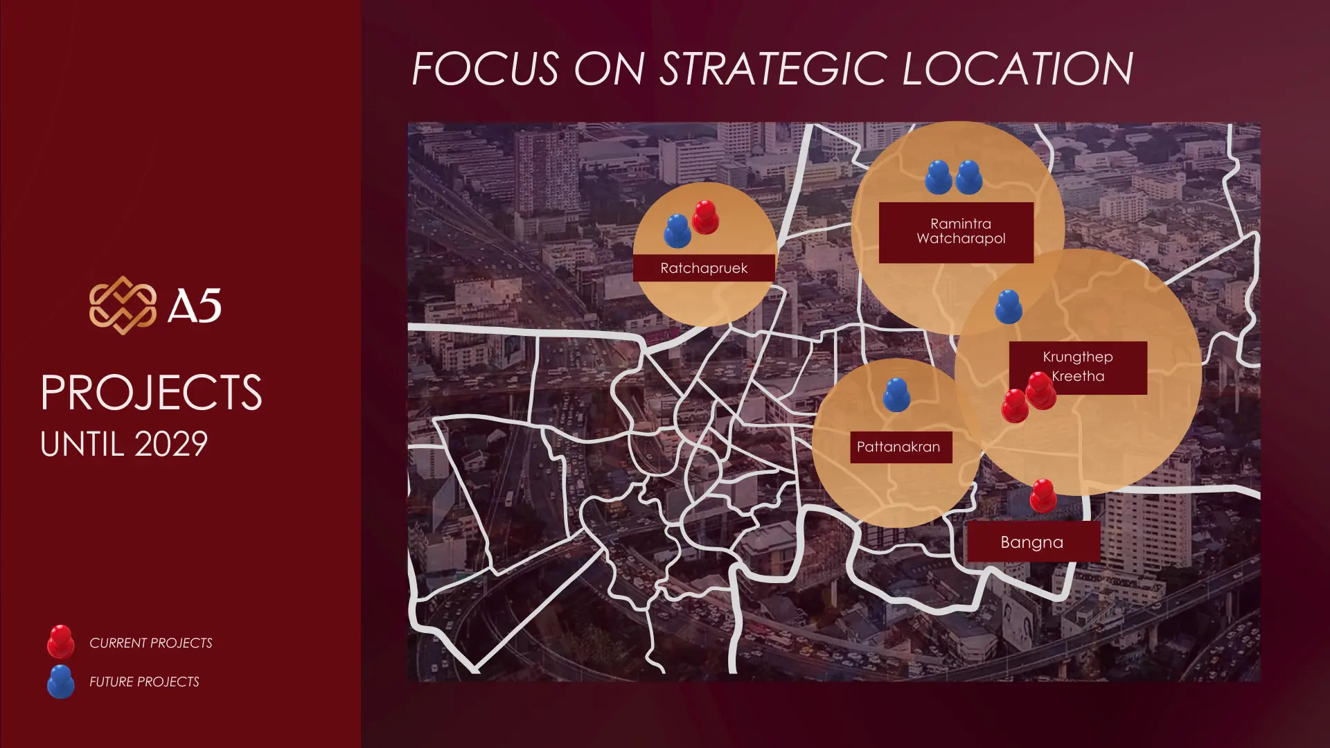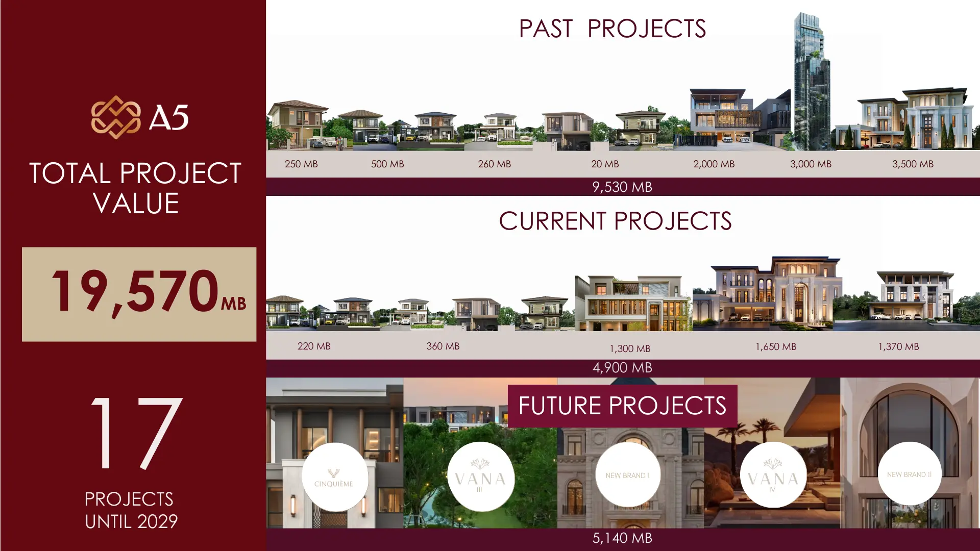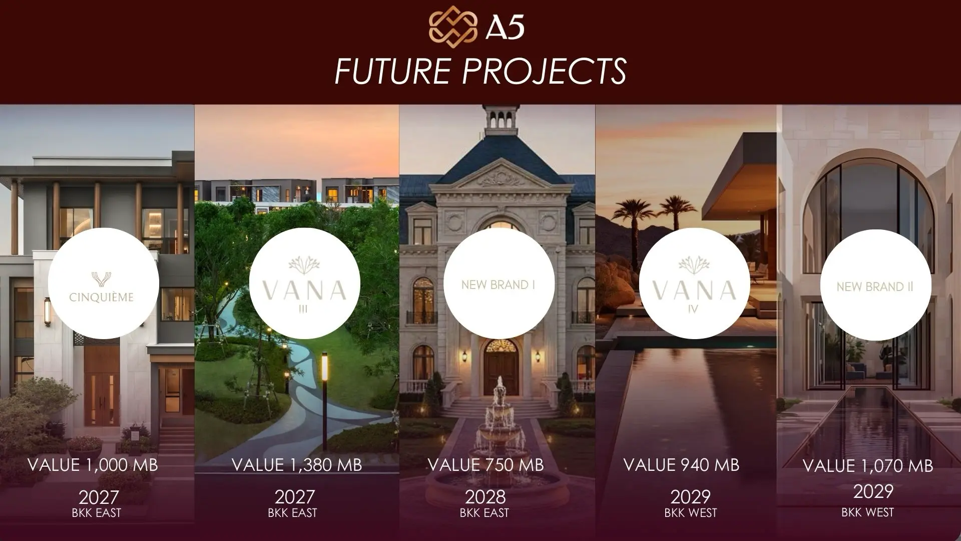 ทั้งนี้ บริษัทมีแผนพัฒนาโครงการใหม่ 5 โครงการ มูลค่ารวมกว่า 5,140 ล้านบาท ภายในปี 2572 ในทำเลศักยภาพ อาทิ กรุงเทพกรีฑา ราชพฤกษ์ พัฒนาการ และรามอินทรา–วัชรพล เพื่อรองรับการเติบโตของตลาดบ้านระดับลักชัวรี และขยายศักยภาพธุรกิจของบริษัทในระยะยาว