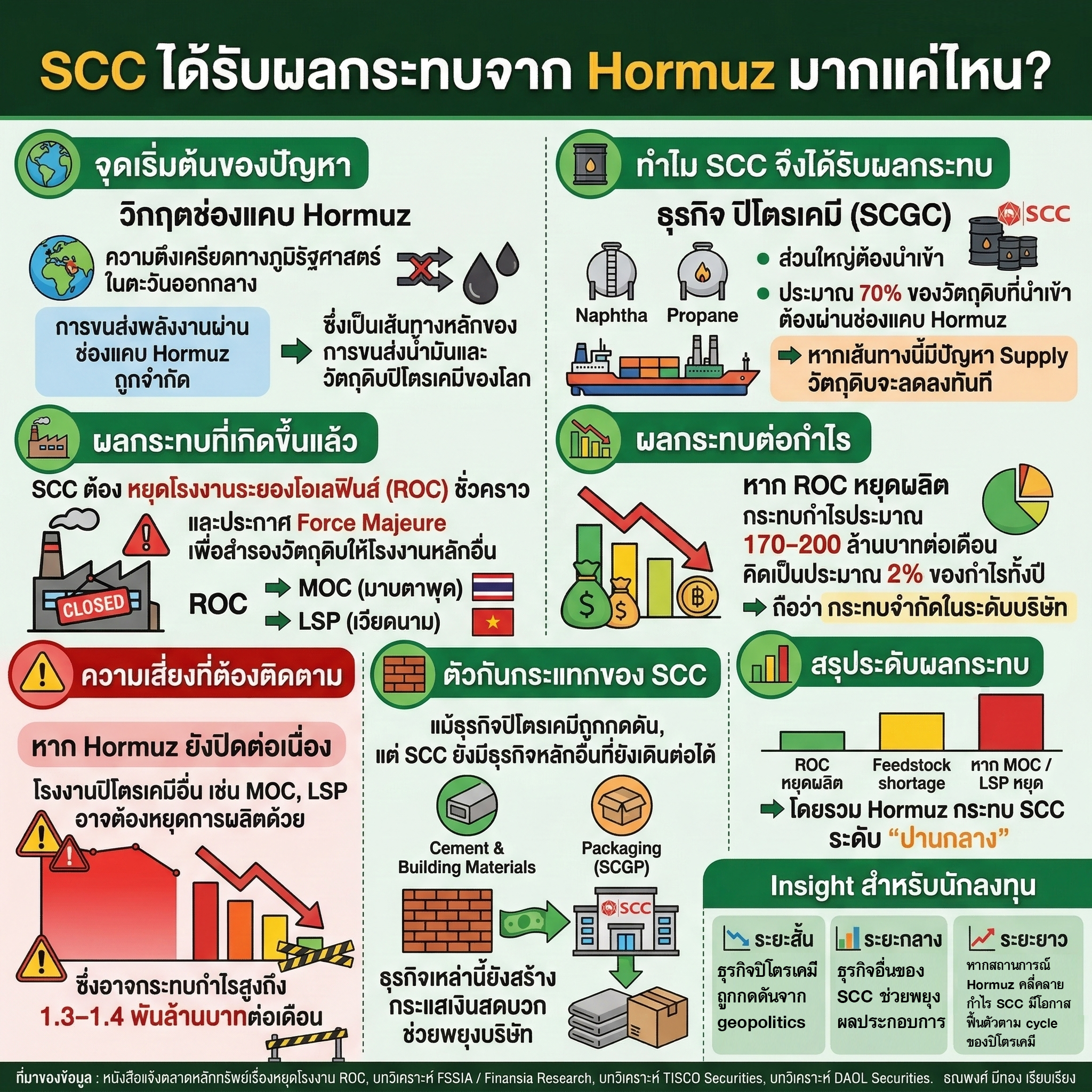 – สิ่งที่นักลงทุนต้องติดตามคือ หาก Hormuz ปิดยาว โรงงานหลักอื่นของ SCC อาจได้รับผลกระทบ