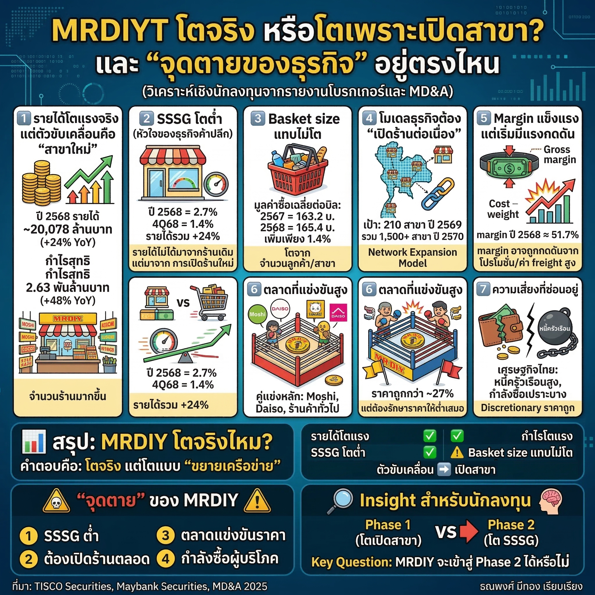 กรณี MRDIYT ปี 2568 มี 1,127 สาขา ครอบคลุม 77 จังหวัดทั่วประเทศ และบริษัทตั้งเป้าเปิดเพิ่ม 210 สาขาในปี 2569 รายได้จึงเติบโตตามจำนวนร้าน ปี 2568 รายได้ 20,078 ล้านบาท โต 24% YoY