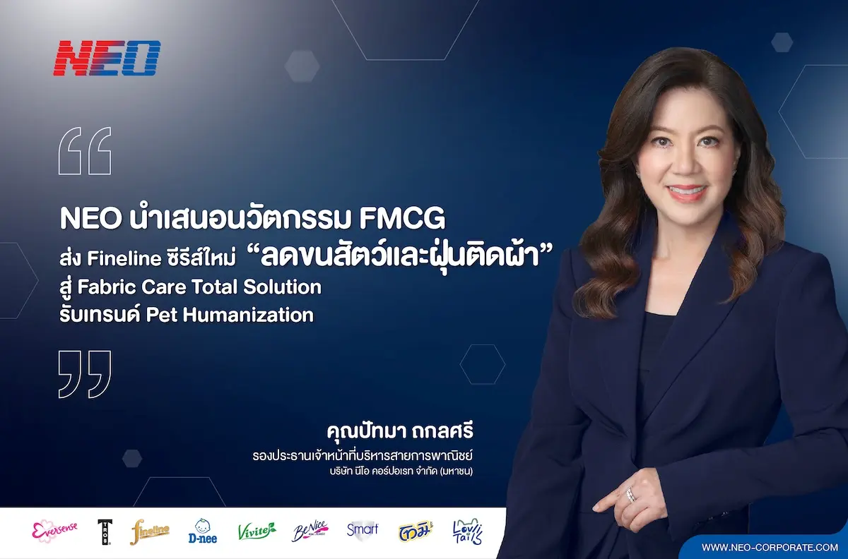 บริษัท นีโอ คอร์ปอเรท จำกัด (มหาชน) (NEO) ผู้นำด้านนวัตกรรมสินค้าอุปโภค (FMCG) ของไทย เดินหน้าตอกย้ำบทบาท Segment Creator ในตลาดผลิตภัณฑ์ดูแลผ้า (Fabric Care) ด้วยการพัฒนานวัตกรรมที่ช่วยลดการเกาะติดของขนสัตว์และฝุ่นบนเนื้อผ้า ซึ่งเป็นหนึ่งใน Pain Point สำคัญของผู้บริโภคยุคใหม่ โดยเฉพาะกลุ่มครอบครัวคนเมืองและคนรักสัตว์เลี้ยง ผ่านการต่อยอดผลิตภัณฑ์ Fineline Premium Care Series หนึ่งในนวัตกรรมสำคัญของบริษัท สู่แนวคิด Fabric Care Total Solution ดูแลผ้าครบทุกขั้นตอน ที่ออกแบบมาเพื่อยกระดับมาตรฐานการดูแลเสื้อผ้าให้ตอบโจทย์ไลฟ์สไตล์ยุค Pet Humanization และการดูแลผ้าในชีวิตประจำวัน