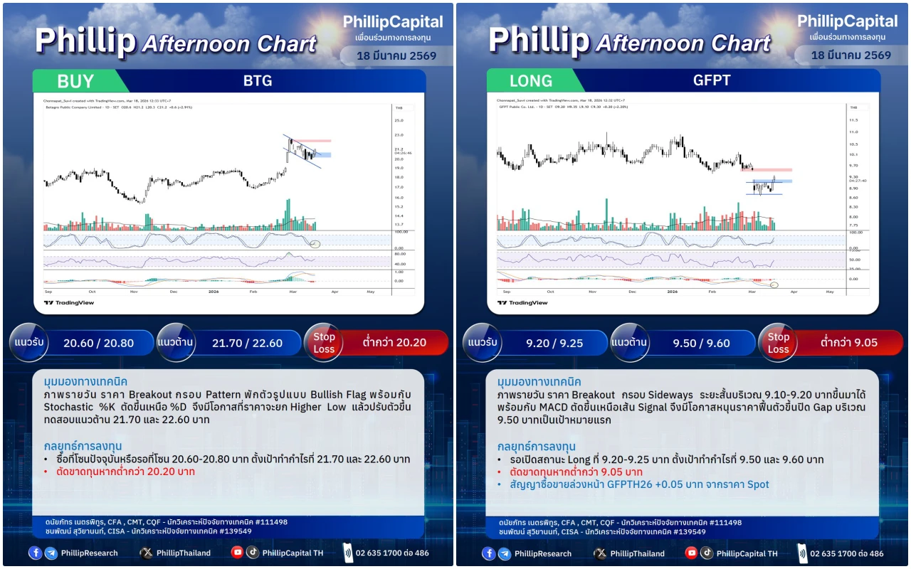หุ้นแนะนำบ่ายนี้ BTG, GFPT (Long)