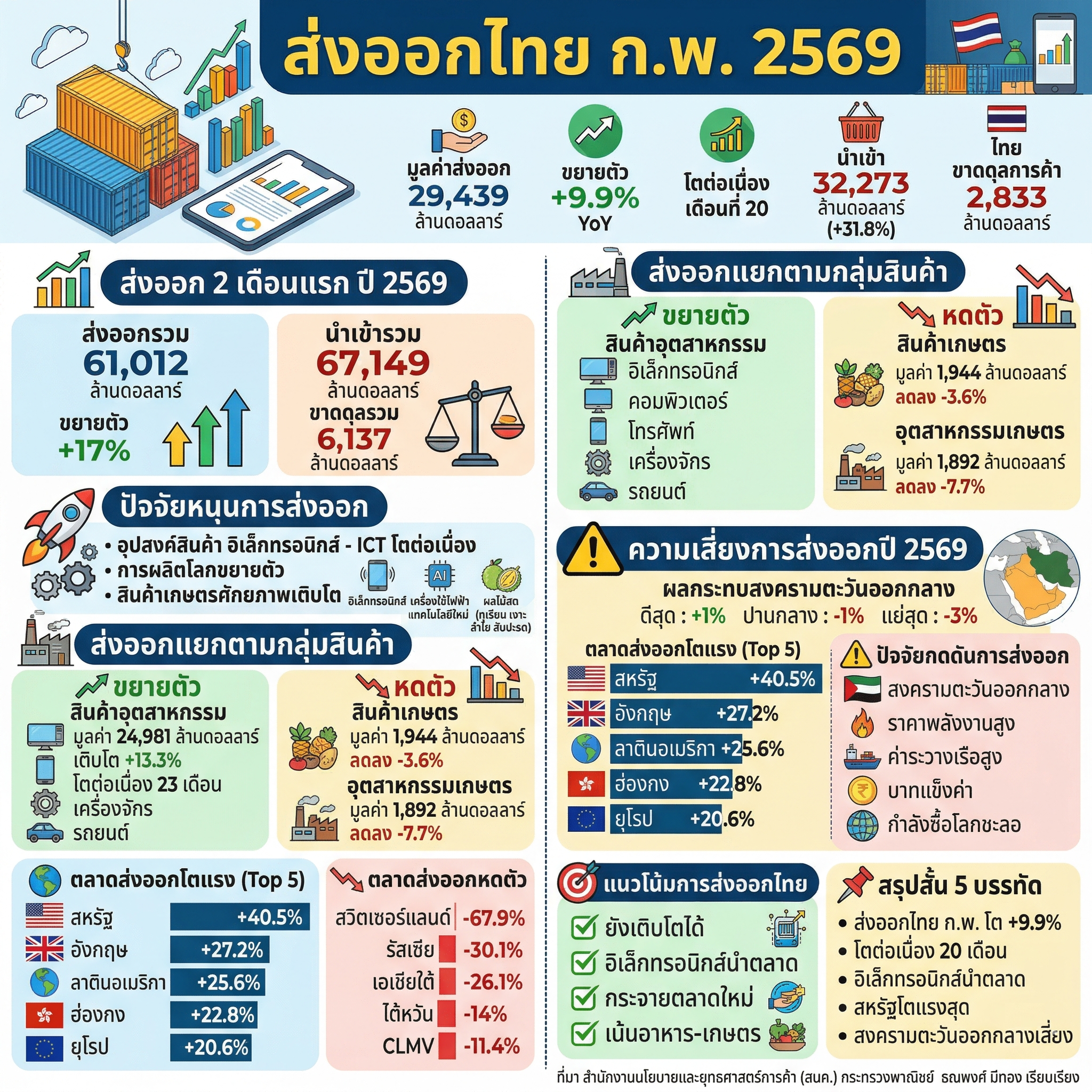 กระทรวงพาณิชย์ เปิดตัวเลขการส่งออกของไทย เดือน ก.พ. 2569 เติบโตแบบชะลอตัว 9.9% แต่ยังบวกต่อเนื่องเดือนที่ 20 พร้อมกับจับตาสงครามตะวันออกกลาง ซึ่งอาจจะกระทบการส่งออกปีนี้อาจจะติดลบ -3 ถึง 1%