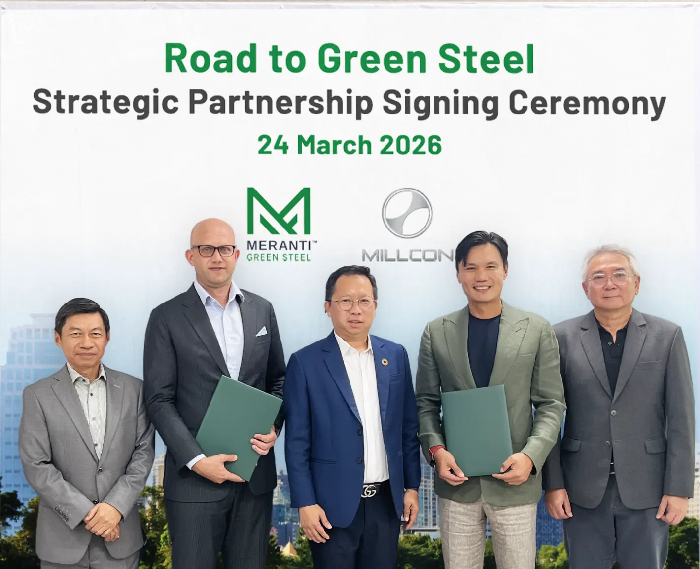 บริษัท มิลล์คอน สตีล จำกัด (มหาชน) หรือ MILL เป็นผู้ผลิตและจำหน่ายผลิตภัณฑ์เหล็กครบวงจร ชั้นนำของประเทศ ได้ร่วมลงนามในบันทึกความเข้าใจ (MOU)กับ บริษัท เมอแรนติ กรีน สตีล ผู้พัฒนาธุรกิจเหล็กสีเขียวจากประเทศสิงคโปร์ เพื่อร่วมมือกันพัฒนาการผลิตเหล็กคาร์บอนต่ำ (Decarbonizing Steel) และส่งเสริมการผลิต Green Steel ในประเทศไทย