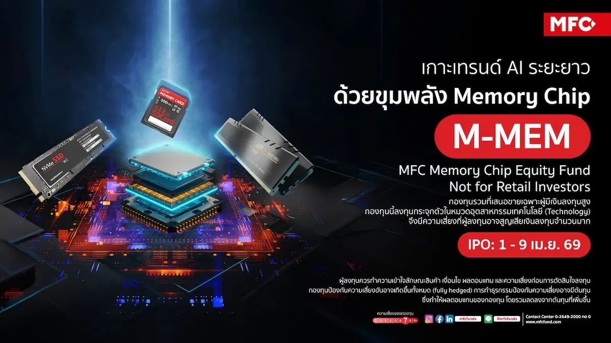 บลจ.เอ็มเอฟ เปิดตัวกองทุนเปิดเอ็มเอฟซี เมมโมรี่ ชิป อิควิตี้ ห้ามขายผู้ลงทุนรายย่อย (MFC Memory Chip Equity Fund Not for Retail Investors) หรือ“M-MEM” เกาะเทรนด์ AI ลงทุนหุ้น Memory Chip หนุนโครงสร้างพื้นฐานสำคัญของเศรษฐกิจดิจิทัลในอนาคต ดันเทรนด์ AI, Data Center ดีมานด์พุ่งสูง ส่งผลหุ้นกลุ่มอุตสาหกรรมชิปหน่วยความจำ เข้าสู่รอบการเติบโตก้าวกระโดดครั้งใหม่ พร้อมเปิดขาย IPO วันที่ 1 – 9 เมษายน 2569 นี้ ลงทุนขั้นต่ำครั้งแรก 500,000 บาท และครั้งถัดไป 1,000 บาท