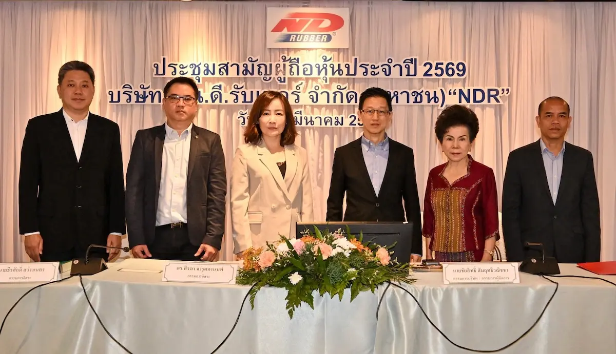 นายชัยสิทธิ์ สัมฤทธิวณิชชา (ที่ 4 จากซ้าย) กรรมการผู้จัดการ พร้อมด้วยคณะกรรมการบริษัท เอ็น.ดี. รับเบอร์ จำกัด (มหาชน) หรือ NDR ผู้ผลิตและจำหน่ายยางนอกและยางในรถจักรยานยนต์ภายใต้แบรนด์ N.D. Rubber ร่วมถ่ายภาพภายหลังเสร็จสิ้นการประชุมสามัญผู้ถือหุ้นประจำปี 2569 โดยที่ประชุมผู้ถือหุ้นมีมติอนุมัติทุกวาระที่คณะกรรมการเสนอเป็นเอกฉันท์ รวมถึงการอนุมัติงบการเงินประจำปี 2568 และวาระสำคัญอื่นๆ ทุกวาระ