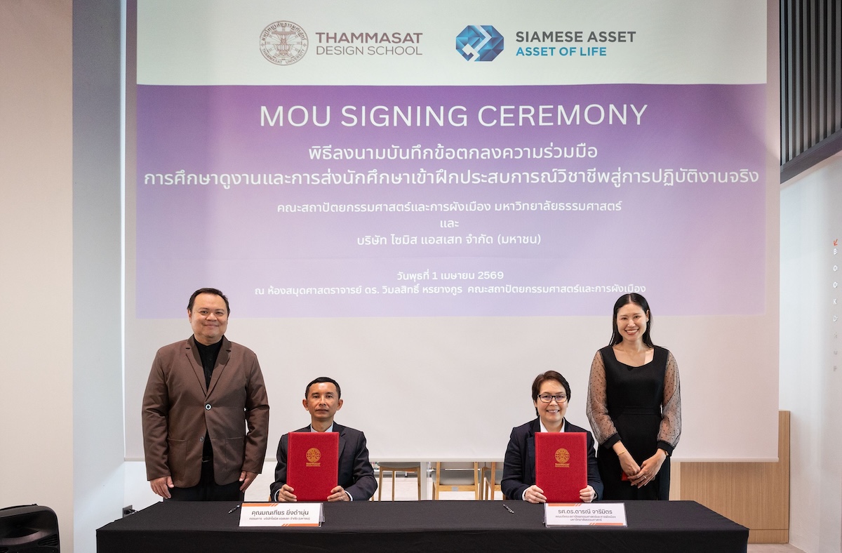 คุณมณเฑียร ยิ่งดำนุ่น ประธานเจ้าหน้าที่ฝ่ายปฏิบัติการร่วม บริษัท ไซมิส แอสเสท จำกัด (มหาชน) หรือ SA ร่วมลงนามบันทึกข้อตกลงทางวิชาการว่าด้วย “การศึกษาดูงานและการส่งนักศึกษาเข้าฝึกประสบการณ์วิชาชีพสู่การปฏิบัติงานจริง” กับ รศ.ดร.ดารณี จารีมิตร คณบดี คณะสถาปัตยกรรมศาสตร์และการผังเมือง มหาวิทยาลัยธรรมศาสตร์ โดยความร่วมมือดังกล่าวจะมุ่งเน้นการพัฒนาทักษะและองค์ความรู้ให้สอดคล้องกับความต้องการของตลาดแรงงาน รวมถึงสนับสนุนและยกระดับมาตรฐานด้านการเรียนการสอนด้วยการลงมือปฏิบัติงานจริง เพื่อสร้างศักยภาพบุคลากรในสายงานธุรกิจสถาปัตยกรรมและอสังหาริมทรัพย์ในอนาคต