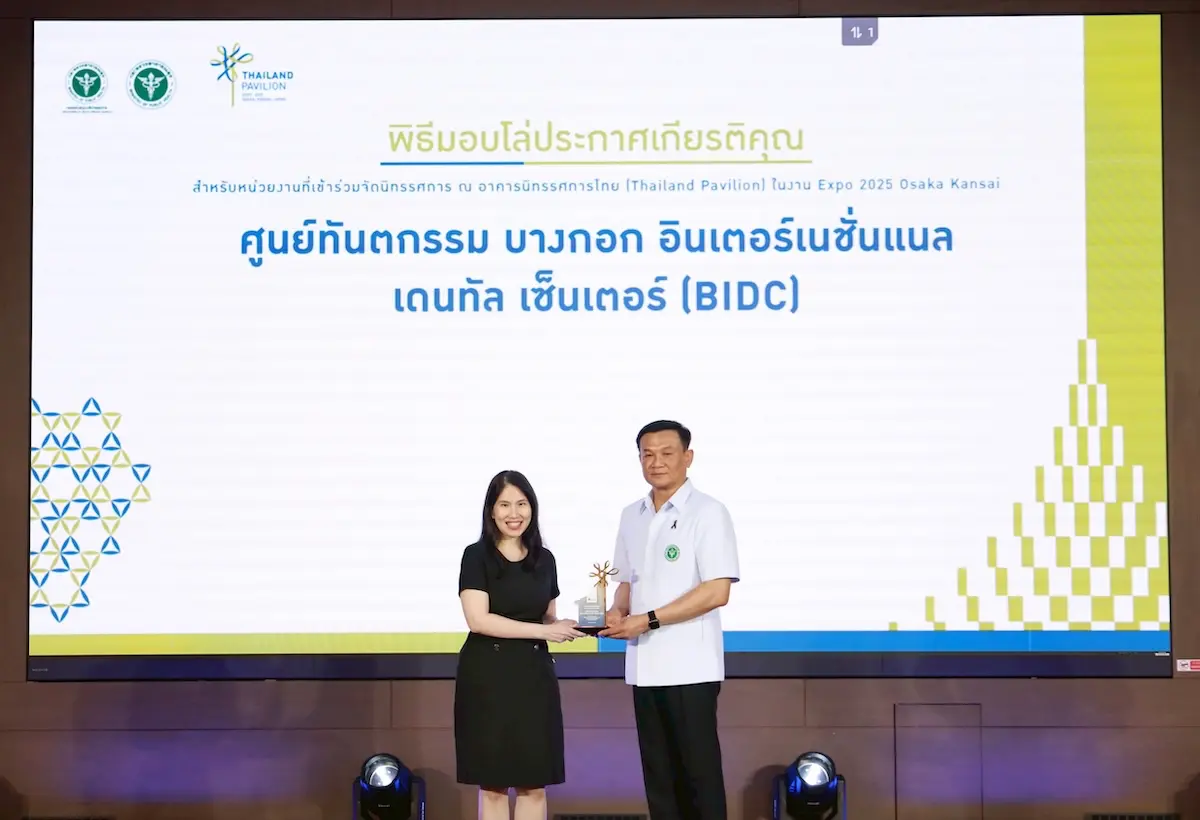 ศูนย์ทันตกรรมบางกอกอินเตอร์เนชั่นแนลเดนทัลเซ็นเตอร์ (Bangkok International Dental Center – BIDC) ผู้นำให้บริการทันตกรรมครบวงจรของประเทศไทยโดยคุณลูซินดาเฉินประธานเจ้าหน้าที่ฝ่ายการตลาด เป็นตัวแทนรับมอบโล่ประกาศเกียรติคุณ จากนายแพทย์สุระ วิเศษศักดิ์ ที่ปรึกษากรมสนับสนุนบริการสุขภาพ (สบส.) ในฐานะเป็นส่วนหนึ่งของหน่วยงานภาคเอกชนที่ได้เข้าร่วมเผยแพร่ข้อมูล และแสดงผลงานนวัตกรรมด้านทันตกรรมของประเทศไทย สู่การเป็นศูนย์กลางด้าน Healthcare และ Dental Tourism ในระดับนานาชาติ จากการจัด Thailand Pavilion งาน Expo 2025 Osaka Kansai ประเทศญี่ปุ่น