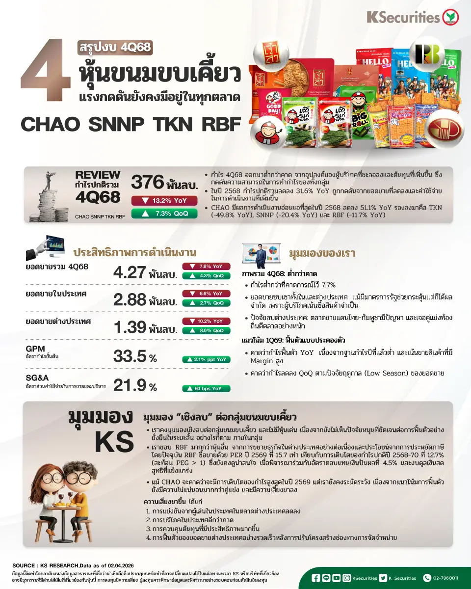 - หุ้นกลุ่มขนมขบเคี้ยว 4 บริษัทภายใต้การวิเคราะห์ของเรา ได้แก่ CHAO, SNNP, TKN และ RBF มีกำไรปกติรวมในไตรมาส 4/2568 อยู่ที่ 376 ลบ. ลดลง 13.2% YoY จากยอดขายที่อ่อนแอทั้งในประเทศและต่างประเทศ รวมถึงต้นทุนการดำเนินงานที่สูงขึ้นจากค่าใช้จ่ายด้านการขาย แต่เพิ่มขึ้น 7.3% QoQ จากปัจจัยฤดูกาลที่เป็นช่วงไฮซีซันของยอดขาย ในปี 2568