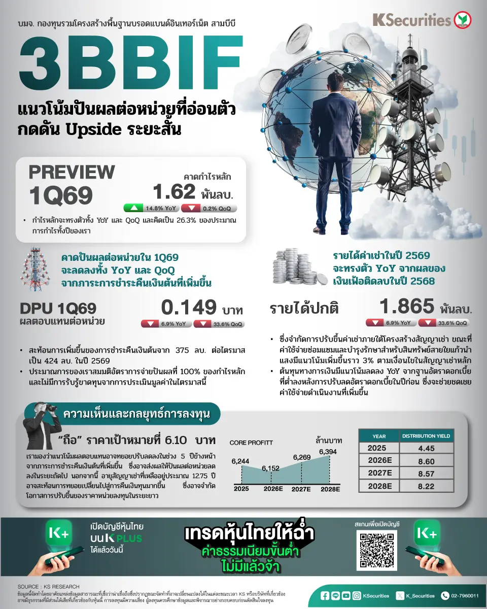 - โดยเราคงคำแนะนำ ถือ สำหรับ 3BBIF ที่ราคาเป้าหมายสิ้นปี 2569 ที่ 6.10 บาท แม้ว่าจุดแข็งของกองทุนอยู่ที่กระแสเงินสดที่มีความแน่นอนสูงตามสัญญาจนถึงปี 2038 แต่เรามองว่าแนวโน้มผลตอบแทนอาจทยอยปรับลดลงในช่วง 5 ปีข้างหน้า จากภาระการชำระคืนเงินต้นที่เพิ่มขึ้น ซึ่งอาจส่งผลให้ปันผลต่อหน่วยลดลงในระยะถัดไป นอกจากนี้ อายุสัญญาเช่าที่เหลืออยู่ประมาณ 12.75 ปี อาจสะท้อนการทยอยเปลี่ยนไปสู่การคืนเงินทุนมากขึ้น ซึ่งอาจจำกัดโอกาสการปรับขึ้นของราคาหน่วยลงทุนในระยะยาว