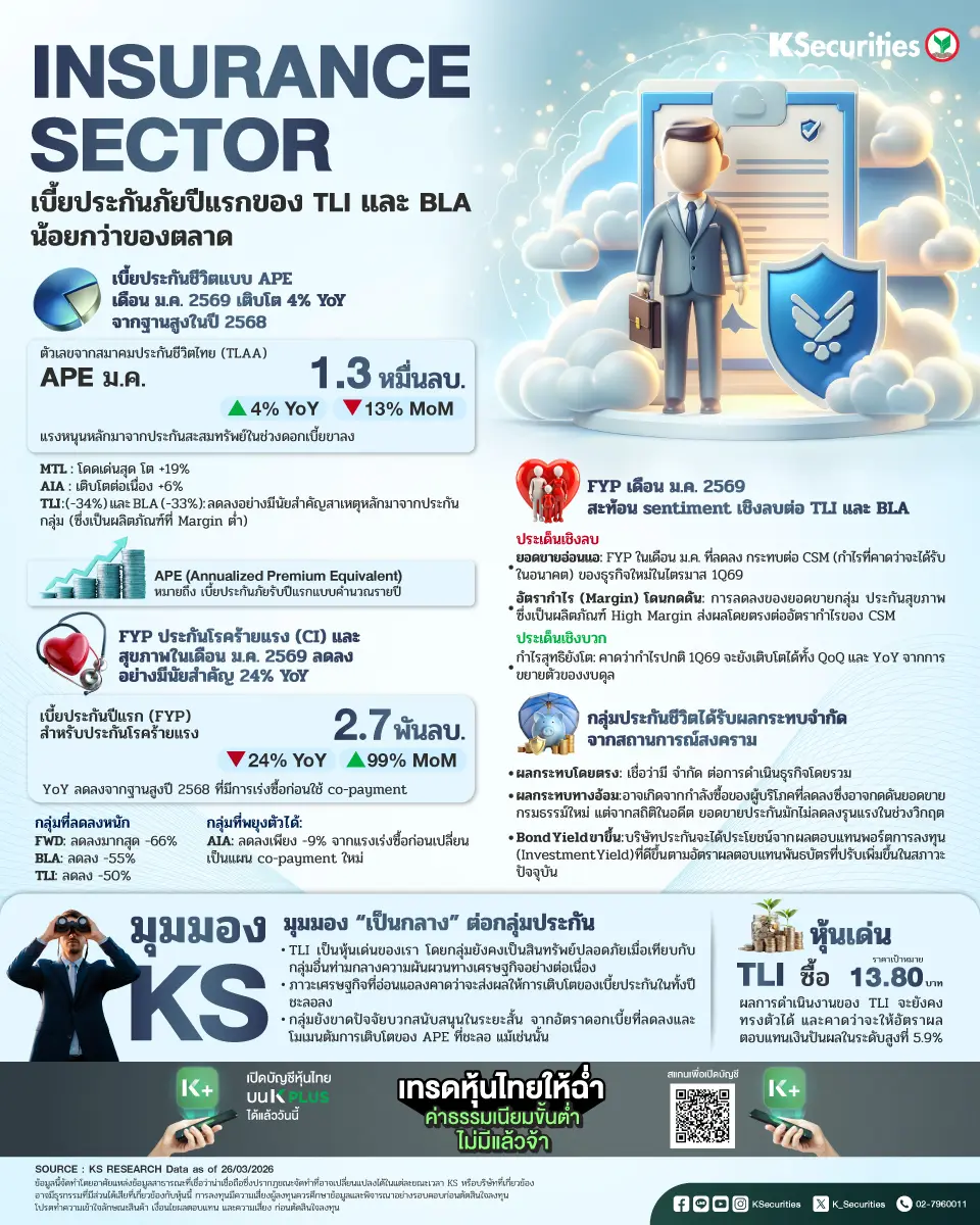 - สมาคมประกันชีวิตไทย (TLAA) รายงานเบี้ยประกันภัยรับรวมแบบ APE ในเดือนม.ค. 2569 อยู่ที่ 1.3 หมื่นลบ. ลดลง 13% MoM แต่เพิ่มขึ้น 4% YoY โดยการลดลง MoM เป็นผลจากฤดูกาลขายประกันชีวิตช่วงปลายปีเพื่อใช้สิทธิลดหย่อนภาษีในไตรมาส 4/2568 อย่างไรก็ตาม ผลการดำเนินงาน YoY ยังแสดงการเติบโตเล็กน้อยแม้มีฐานสูงในปี 2568 โดยได้รับแรงหนุนจากผลิตภัณฑ์แบบสะสมทรัพย์ในช่วงที่อัตราผลตอบแทนพันธบัตรปรับลดลง เมืองไทยประกันชีวิต (MTL) มีการเติบโตสูงสุดในเดือนม.ค. ที่ 19% YoY รองลงมาคือ AIA (ประเทศไทย) ที่ 6% YoY ในทางกลับกัน ไทยประกันชีวิต (TLI) มีการลดลงอย่างมีนัยสำคัญที่ 34% YoY ในเดือนม.ค. ขณะที่ กรุงเทพประกันชีวิต (BLA) ลดลง 33% YoY ทั้งคู่หลักๆลดลงมาจากประกันกลุ่ม ซึ่งมีอัตรากำไรที่ต่ำ