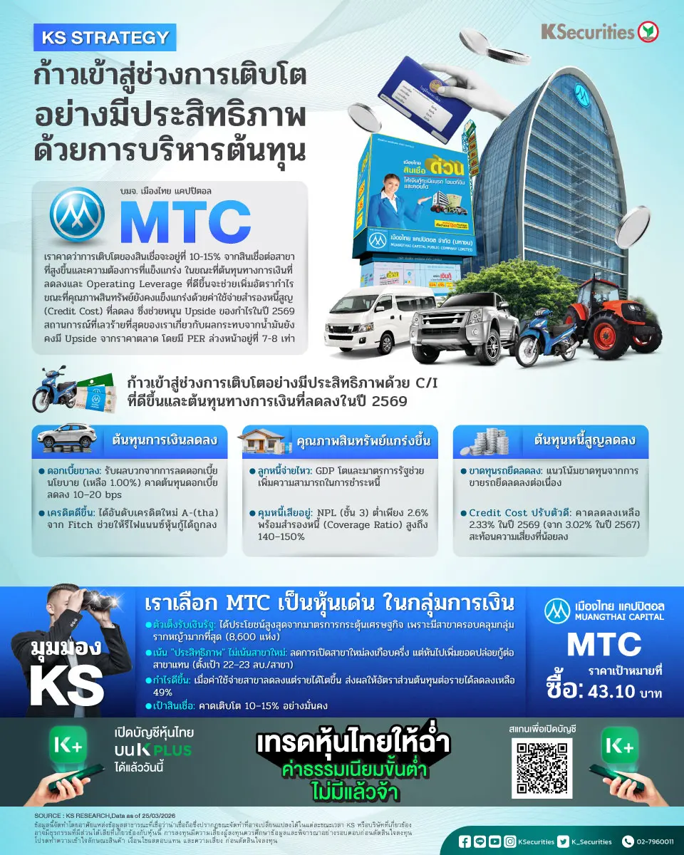 - เรายังคงมีมุมมองเชิงบวกต่อกลุ่มการเงิน โดยเลือก MTC เป็นหุ้นเด่น เราคาดว่า MTC จะได้รับประโยชน์มากที่สุดจากมาตรการกระตุ้นเศรษฐกิจของภาครัฐ โดยได้รับแรงหนุนจากเครือข่ายสาขาที่ครอบคลุมทั่วประเทศและการมีฐานลูกค้าในกลุ่มเกษตรกรและผู้มีรายได้น้อยในสัดส่วนสูง ปัจจุบัน MTC มีสาขาประมาณ 8,600 แห่งทั่วประเทศ ซึ่งเป็นเครือข่ายที่ใหญ่ที่สุดในอุตสาหกรรม เราคาดว่าการเติบโตของสินเชื่อจะอยู่ที่ 10–15% ในปี 2569 โดยถูกขับเคลื่อนหลักจากการเพิ่มประสิทธิภาพของสาขาเดิม มากกว่าการขยายสาขาอย่างเร่งตัว โดยบริษัทฯ ตั้งเป้าเพิ่มสินเชื่อต่อสาขาจากประมาณ 20 ลบ. เป็น 22–23 ลบ. ขณะเดียวกันจะลดการเปิดสาขาใหม่เหลือ 300–400 แห่งในปี 2569 จากระดับ 600 แห่งต่อปีในช่วงก่อนหน้า เราเชื่อว่าการเติบโตของสินเชื่อได้รับแรงหนุนจากความต้องการของลูกค้าที่แข็งแกร่งอย่างต่อเนื่อง นอกจากนี้ เราคาดว่า MTC จะมีโอกาสปรับปรุงประสิทธิภาพการดำเนินงานในปี 2569 โดยจากการเปิดสาขาใหม่ที่ลดลงและการมุ่งเน้นเพิ่มสินเชื่อต่อสาขา บริษัทฯ จะได้รับประโยชน์จาก operating leverage ส่งผลให้เราคาดว่าอัตราส่วนต้นทุนต่อรายได้จะปรับตัวดีขึ้นจากประมาณ 50% เป็น 49% ในปี 2569 สะท้อนถึงการควบคุมต้นทุนที่ดีขึ้นและประสิทธิภาพของสาขาที่เพิ่มขึ้น