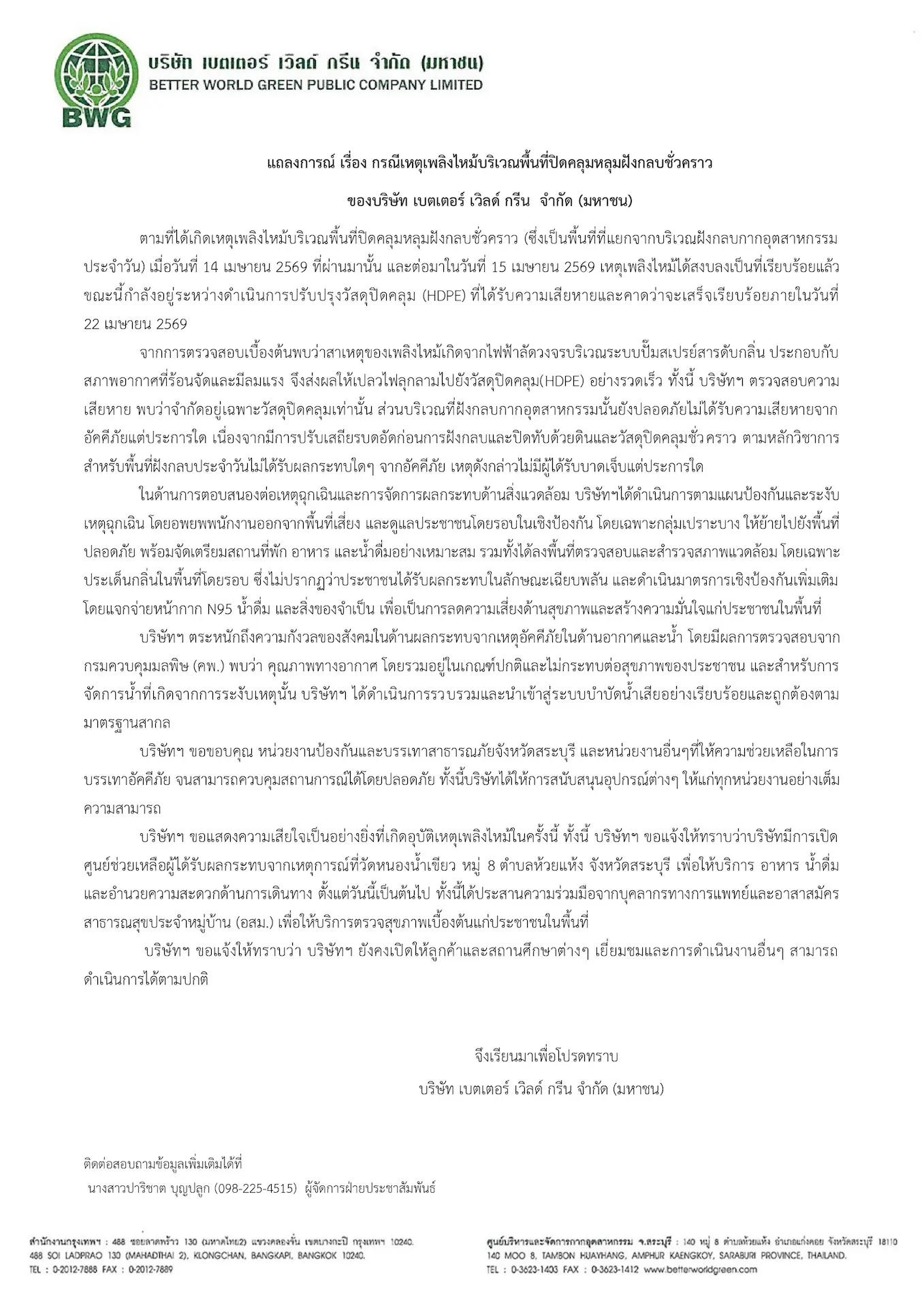 บริษัท เบตเตอร์ เวิลด์ กรีน จำกัด (มหาชน) หรือ BWG แถลงการณ์กรณีเหตุเพลิงไหม้บริเวณพื้นที่ปิดคลุมหลุมฝังกลบชั่วคราว