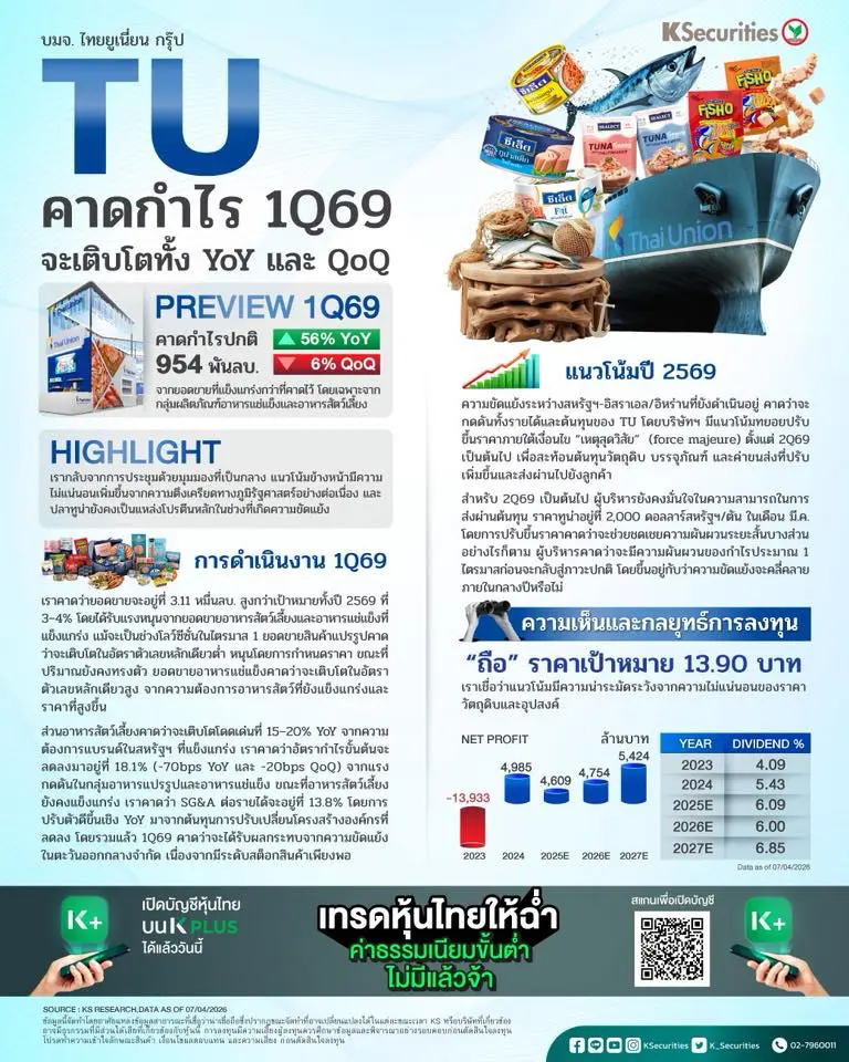 - ความขัดแย้งระหว่างสหรัฐฯ-อิสราเอล/อิหร่านที่ยังดำเนินอยู่ คาดว่าจะกดดันทั้งรายได้และต้นทุนของ TU โดยบริษัทฯ มีแนวโน้มทยอยปรับขึ้นราคาภายใต้เงื่อนไข “เหตุสุดวิสัย” (force majeure) ตั้งแต่ไตรมาส 2/2569 เป็นต้นไป เพื่อสะท้อนต้นทุนวัตถุดิบ บรรจุภัณฑ์ และค่าขนส่งที่ปรับเพิ่มขึ้นและส่งผ่านไปยังลูกค้า สำหรับไตรมาส 2/2569 เป็นต้นไป