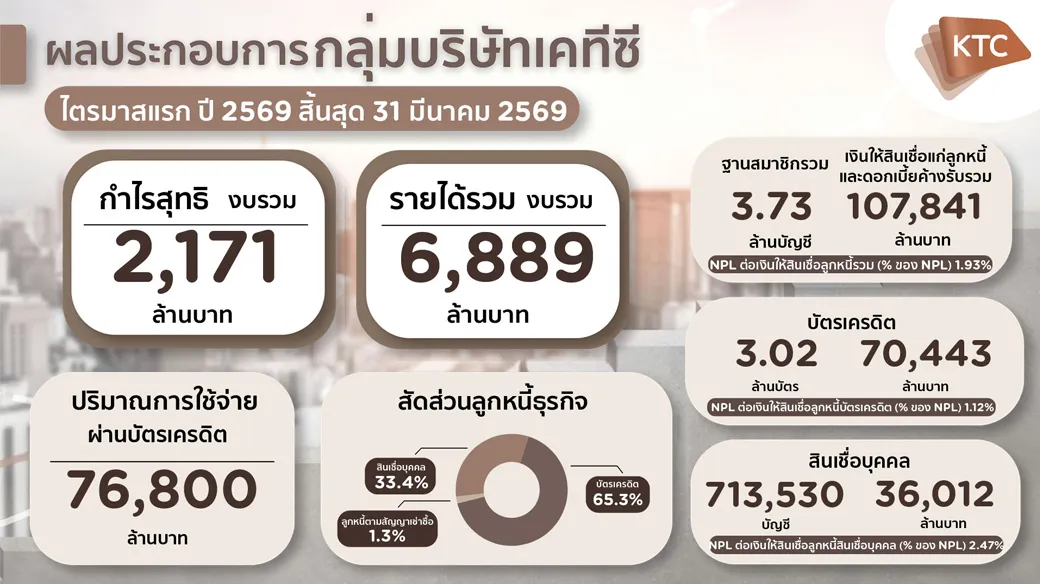 “ขณะเดียวกัน กลุ่มบริษัทเคทีซียังคงให้ความสำคัญกับการบริหารความเสี่ยงและการควบคุมคุณภาพพอร์ตอย่างเข้มงวด ควบคู่กับการใช้ข้อมูลเชิงลึกในการดูแลคุณภาพสินทรัพย์อย่างใกล้ชิด ส่งผลให้สามารถรักษาความแข็งแกร่งของฐานรายได้และผลการดำเนินงานได้อย่างต่อเนื่อง โดยในไตรมาส 1 ปี 2569 กลุ่มบริษัทมีกำไรสุทธิ 2,171 ล้านบาท เติบโตสูงกว่าช่วงเดียวกันของปีก่อน ซึ่งสะท้อนความสามารถในการปรับตัวท่ามกลางสภาวะตลาดที่ท้าทาย สำหรับการเติบโตของพอร์ตสินเชื่อในไตรมาสแรก เคทีซียังคงดำเนินนโยบายการอนุมัติสินเชื่อโดยให้ความสำคัญกับคุณภาพเป็นหลัก ส่งผลให้พอร์ตลูกหนี้บัตรเครดิตปรับเพิ่มขึ้นเพียงเล็กน้อย ขณะที่อัตราการชำระคืนของลูกค้าปรับตัวสูงขึ้น ในส่วนของพอร์ตสินเชื่อบุคคล ยังคงขยายตัวจากทั้งสินเชื่อ ‘เคทีซี พี่เบิ้ม รถแลกเงิน’ และสินเชื่อบัตรกดเงินสด ‘เคทีซี พราว’ ซึ่งสามารถรักษาการเติบโตได้อย่างต่อเนื่อง จากการบริหารจัดการพอร์ตลูกหนี้อย่างมีคุณภาพ และการพัฒนาสิทธิประโยชน์เพื่อตอบโจทย์ความต้องการของสมาชิกอย่างต่อเนื่อง”