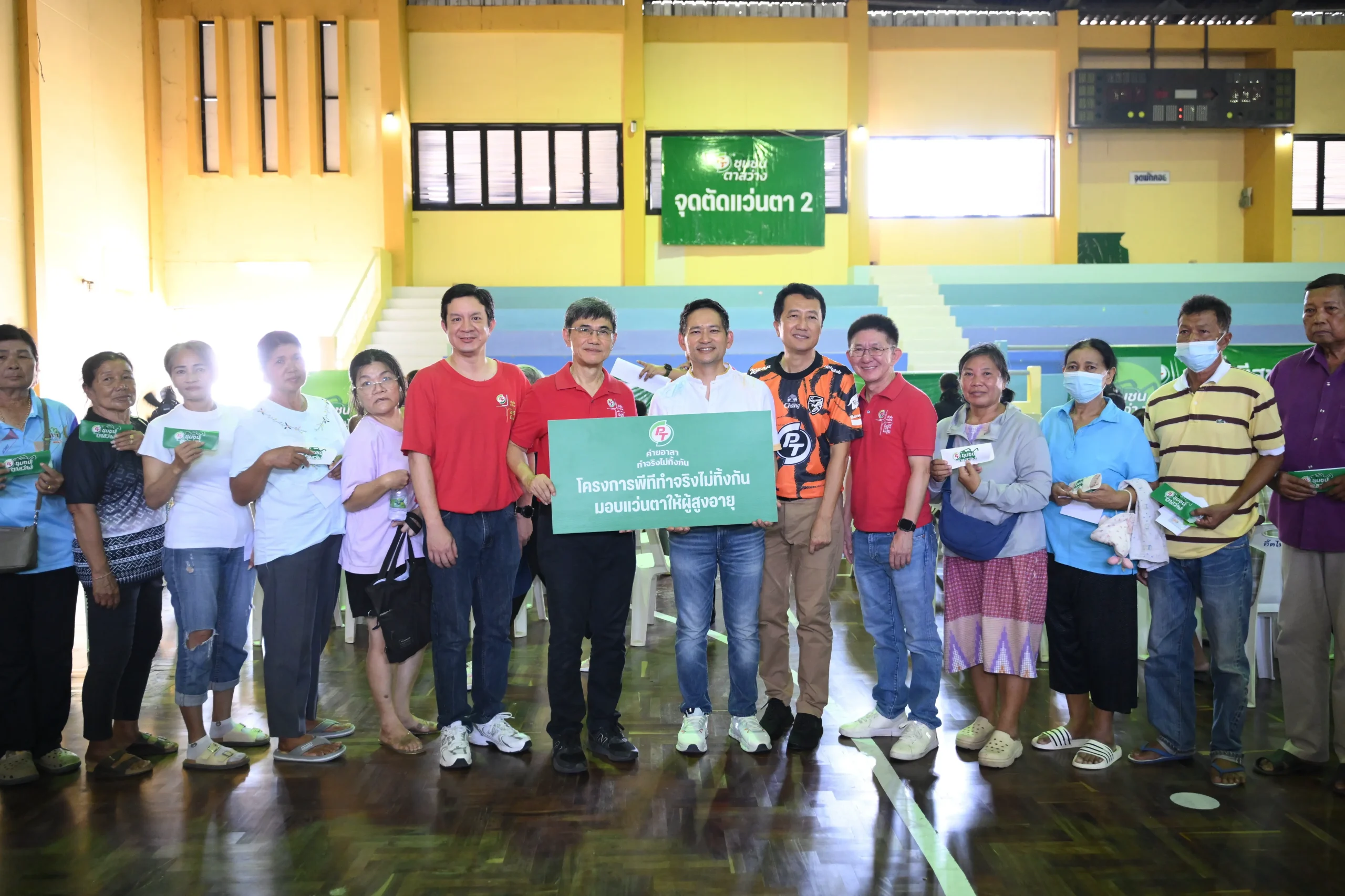ไฮไลท์สำคัญของงานคือโครงการ “พีที ชุมชนตาสว่าง” ซึ่งเป็นการจัดหน่วยบริการวัดสายตาประกอบแว่นฟรี และให้ความรู้เรื่องการดูแลดวงตาแก่ผู้สูงอายุในชุมชน โดยในครั้งนี้ได้ส่งมอบแว่นตาให้กับผู้สูงอายุเพิ่มเติมอีก 300 คน จากเดิมที่โครงการได้ส่งมอบไปแล้วกว่า 7,225 คน ทั่วประเทศ เพื่อให้ผู้สูงวัยสามารถกลับมาใช้ชีวิตประจำวันได้อย่างสะดวกและมีคุณภาพชีวิตที่ดีขึ้น