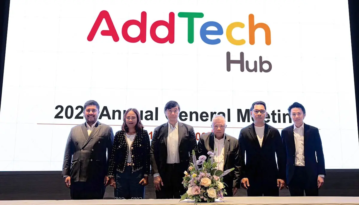 นายจิรพันธ์ สินธุนาวา (กลางขวา) ประธานกรรมการบริษัท นายชวัล บุญประกอบทรัพย์ (ขวา) ประธานเจ้าหน้าที่บริหาร พร้อมด้วย คณะกรรมการบริษัท แอดเทค ฮับ จำกัด (มหาชน) หรือ ADD ผู้ดำเนินธุรกิจให้บริการดิจิทัลคอนเทนต์และให้บริการดิจิทัลโซลูชัน ร่วมประชุมสามัญผู้ถือหุ้นประจำปี 2569 ผ่านสื่ออิเล็กทรอนิกส์ (E-AGM) โดยที่ประชุมผู้ถือหุ้นมีมติอนุมัติจ่ายเงินปันผลจากผลการดำเนินงานปี 2568 เพิ่มเติมในอัตรา 0.09 บาทต่อหุ้น โดยกำหนดจ่ายเงินปันผลในวันที่ 5 พฤษภาคม 2569 ส่วนแผนธุรกิจในปี 2569 เดินหน้าโฟกัสธุรกิจหลักด้านการพัฒนาระบบสำคัญ เช่น ระบบโหวตแคมเปญระดับประเทศ, ระบบเสียงรอสายรูปแบบใหม่ และระบบแลกคะแนนสะสม (Point Redemption) สำหรับสถาบันการเงินและองค์กรใหญ่ เพื่อสร้างรายได้มั่นคง พร้อมปรับโครงสร้างเพื่อลดความเสี่ยง ทำให้การเงินแข็งแรงและพร้อมเติบโตอย่างยั่งยืน