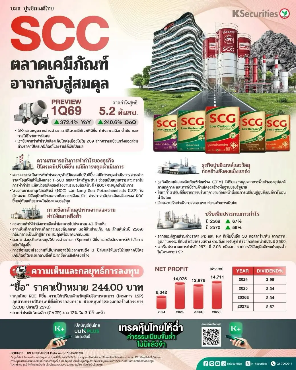 - แนะนำ “ซื้อ” ราคาเป้าหมาย ที่ 244.00 บาท โดยได้รับแรงหนุนจาก ROE ที่ดีขึ้น (จาก 2% เป็น 4%) และข้อได้เปรียบด้านวัตถุดิบอีเทนในระยะยาวของโครงการ LSP ทั้งนี้ ความตึงตัวเชิงโครงสร้างในอุตสาหกรรมปิโตรเคมีจากภาวะสงครามจะช่วยสนับสนุนรายได้ของ SCC ในระหว่างการก่อสร้างโครงการรับอีเทน (SCOD=สิ้นปี 2570) ดังนั้น รายได้ของบริษัทฯ จะค่อยๆ ดีขึ้นในอัตราการเติบโตเฉลี่ยต่อปี (CAGR) ที่ 13% ในอีก 3 ปีข้างหน้า