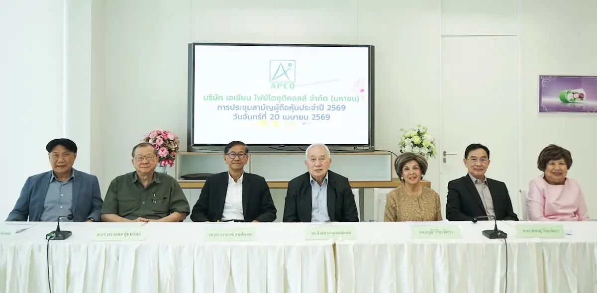 นางมาลีรัตน์ ปลื้มจิตรชม ประธานกรรมการและกรรมการอิสระ (ขวา) ศ.ดร.พิเชษฐ์ วิริยะจิตรา ประธานเจ้าหน้าที่บริหาร (ที่ 2 จากขวา) พร้อมคณะกรรมการ บริษัท เอเชียน ไฟย์โตซูติคอลส์ จำกัด (มหาชน) (APCO) จัดงานประชุมสามัญผู้ถือหุ้นประจำปี 2569 อนุมัติจ่ายปันผลอัตรา 0.091 บาท/หุ้น หรือคิดเป็น 100.07% ของกำไรสุทธิฯ ต่อเนื่องเป็นปีที่ 15 กำหนด Record Date 29 เม.ย.69 จ่ายปันผล 13 พ.ค. 69 ณ สำนักงาน APCO ชั้น 30 อาคาร AIA กรุงเทพฯ เมื่อเร็วๆนี้