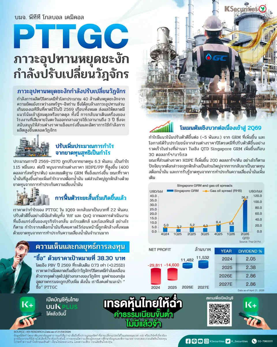 ประมาณการปี 2569–2570 ถูกปรับจากขาดทุน 6.3 พันลบ. เป็นกำไร 1.15 หมื่นลบ. ต่อปี หนุนจากส่วนต่างราคา HDPE/PP ที่สูงขึ้น (400 ดอลลาร์สหรัฐฯ/ตัน) และสมมติฐาน GRM ที่แข็งแกร่งขึ้น ขณะที่ราคาน้ำมันที่สูงขึ้นช่วยเพิ่มกำไรจากสต็อกน้ำมัน แต่ส่วนใหญ่ถูกหักล้างด้วยขาดทุนจากการทำประกันความเสี่ยงน้ำมัน