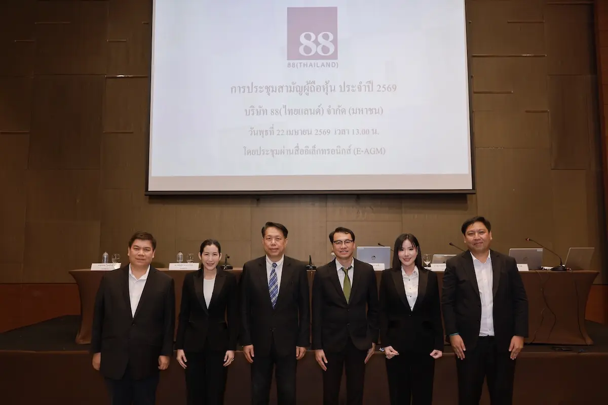 นายดุษิต จงสุทธนามณี ประธานกรรมการ และนางสาวนพรัตน์ มาลัยวงค์ ผู้ก่อตั้งและกรรมการ บริษัท 88(ไทยแลนด์) จำกัด (มหาชน) “88TH” พร้อมด้วยคณะกรรมการบริษัทฯ จัดการประชุมสามัญผู้ถือหุ้นประจำปี 2569 ผ่านสื่ออิเล็กทรอนิกส์ (E-AGM) เพื่อรายงานผลการดำเนินงานงวดปี 2568 ที่เติบโตอย่างโดดเด่น โดยมีกำไรสุทธิ 101 ล้านบาท เพิ่มขึ้นถึง 45.23 ล้านบาท หรือ 81.10% (YoY) ดันอัตรากำไรสุทธิ (Net Profit Margin) จาก 11.67% ปีก่อน ทะยานขึ้นไปแตะ 15.36% และพิจารณาวาระสำคัญต่างๆ โดยที่ประชุมมีมติอนุมัติครบทุกวาระตามข้อเสนอของคณะกรรมการ สะท้อนถึงศักยภาพ และความเชื่อมั่นต่อธุรกิจของบริษัทฯ