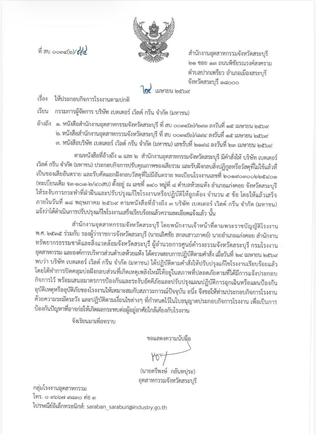 สำนักงานอุตสาหกรรมจังหวัดสระบุรี (อสจ.) ประกาศคืนใบเบิกทางให้ บริษัท เบตเตอร์ เวิลด์ กรีน จำกัด (มหาชน) หรือ BWGกลับมาเดินเครื่องประกอบกิจการได้ตามปกติอย่างเป็นทางการ ภายหลังจากบริษัทฯ โชว์ศักยภาพการแก้ไขปรับปรุงโรงงานจนเสร็จสมบูรณ์แบบร้อยเปอร์เซ็นต์ตามคำสั่งพนักงานเจ้าหน้าที่ เผยมาตรการความปลอดภัยชุดใหม่เข้มข้นกว่าเดิม พร้อมสร้างความเชื่อมั่นให้ชุมชนรอบพื้นที่