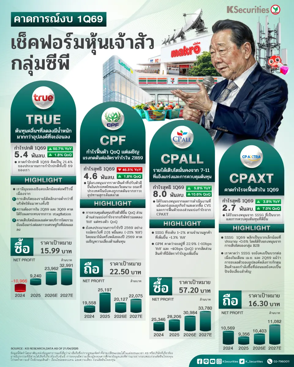 - คาดกำไรไตรมาส 1/2569 จะเติบโต YoY และ QoQ โดยกำไรสุทธิคาดว่าจะอยู่ที่ 8 พันลบ. (+5.8% YoY และ +10.6% QoQ) ได้รับแรงหนุนจากผลการดำเนินงานที่แข็งแกร่งของธุรกิจร้านสะดวกซื้อ CVS และการฟื้นตัวของส่วนแบ่งกำไรจาก CPAXT