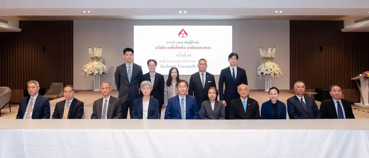 คุณสุรพล เตชะหรูวิจิตร ประธานเจ้าหน้าที่บริหาร, คุณสุรพงษ์ เตชะหรูวิจิตรกรรมการผู้จัดการ และคุณพัชรพล เตชะหรูวิจิตร ผู้ช่วยประธานเจ้าหน้าที่บริหาร บริษัท เอเชียโฮเต็ล จำกัด (มหาชน) หรือ ASIA พร้อมด้วยคณะกรรมการบริษัทฯ ร่วมกันถ่ายภาพเป็นที่ระลึกในงานประชุมสามัญผู้ถือหุ้นประจำปี 2569 โดยที่ประชุมพิจารณาอนุมัติทุกวาระ พร้อมกับมีมติเป็นเอกฉันท์จ่ายปันผลจากผลการดำเนินงานงวดปี 2568 ในอัตราหุ้นละ 0.05 บาท กำหนดจ่ายเงินปันผลในวันที่ 8 พฤษภาคม 2569 พร้อมรายงานและนำเสนอข้อมูลผลการดำเนินงานปี 2568 ให้ผู้ถือหุ้นรับทราบ ซึ่งงานดังกล่าวจัดขึ้น ณ ห้องกิ่งเพชร ชั้น 3 โรงแรมเอเชีย กรุงเทพ เมื่อเร็วๆ นี้